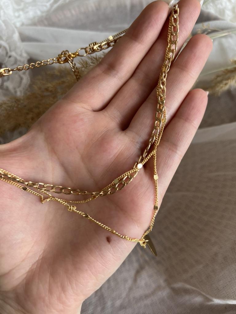 Модная штучка 👌 Многослойное колье, состоящее из цепочек разных длин и плетений 😍💫 Такое колье отлично вписывается в любой образ 👌👌👌 Многослойные цепочки классно смотрятся даже с самой простой футболкой. Что уж говорить про платья 🥰 они идеально сочетаются с многослойными украшениями. Я очень довольна этим заказом. Тонкие цепочки имеют очень необычные точечки, которые красиво играют при свете 🤩💫 Объемная цепочка тоже имеет красивое плетение, она смотрится брутально на контрасте с тонкими цепочками. Цвет бижутерии похож на настояшее желтое золото (колье отлично подошло к моей любимой длинной цепочке). Продавец хорошо упаковывает свои товары. Колье лежало в картонной специальной коробочке, коробка была хорошо замотана пупырчатой пленкой и пришла в илеальном состоянии. А еще продавец кладет подарки, это приятно, спасибо 😊