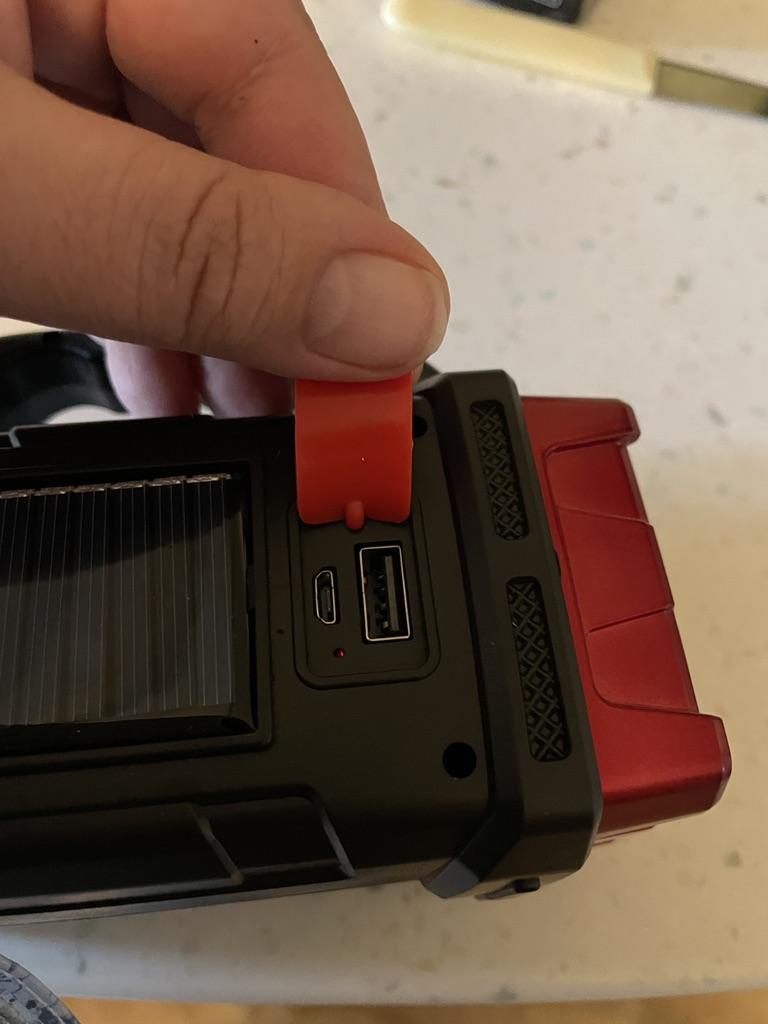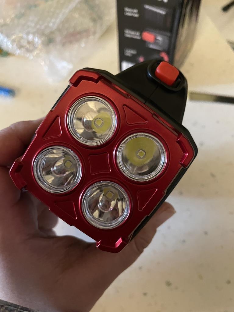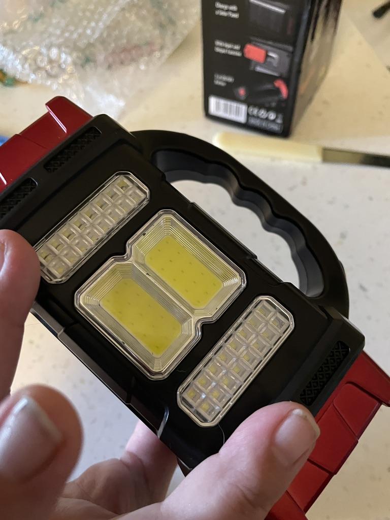 Супер-фонарь. Хотя не очень большой. Пришёл в сборной посылке. Коробка намного помялась, но сам фонарь не пострадал. Кнопки и разъемы с резиновыми крышками - защита от влаги. Одна кнопка включает передние лампочки - неяркого желтого цвета, отлично в качестве ночного света. Эта же кнопка включает яркий белый свет на боковой панели. Другая кнопка включает передние лампочки яркого белого цвета и повторное нажатие включает дополнительный белый свет на боковой панели. Т.е, при включённых двух кнопках светится вся боковая панель очень ярко. Заряжает телефон. Солнечная батарея работает. В комплекте идёт заряжающий провод от usb.
