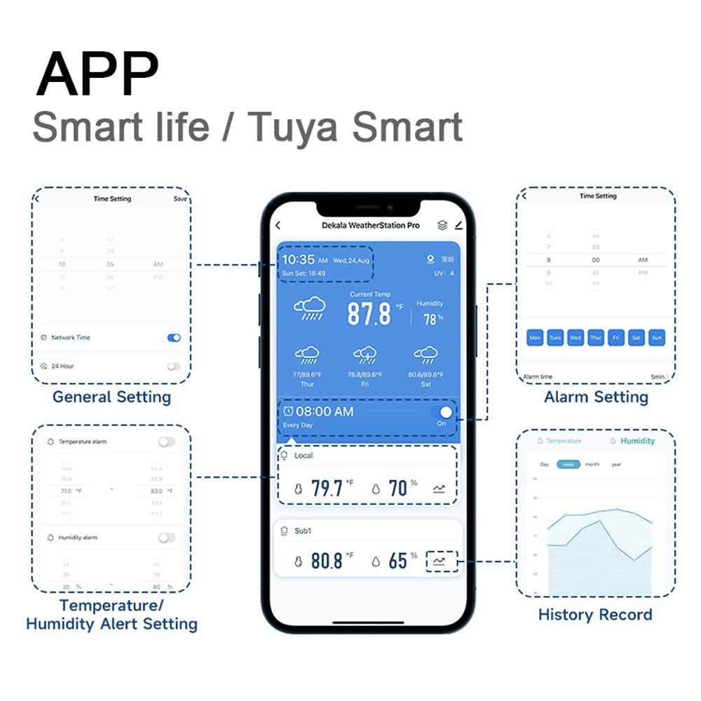 APP интеллектуальное управление, простота в эксплуатации, богатые функции, APP разделяет давление воздуха / ультрафиолет / скорость ветра / температуру и влажность функция сигнализации, вы можете просматривать исторические данные тенденции записи температуры и влажности.