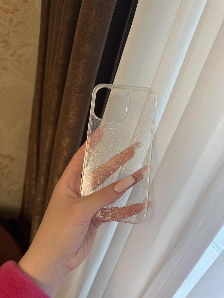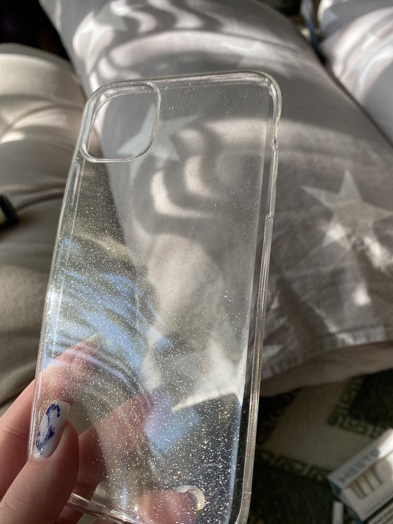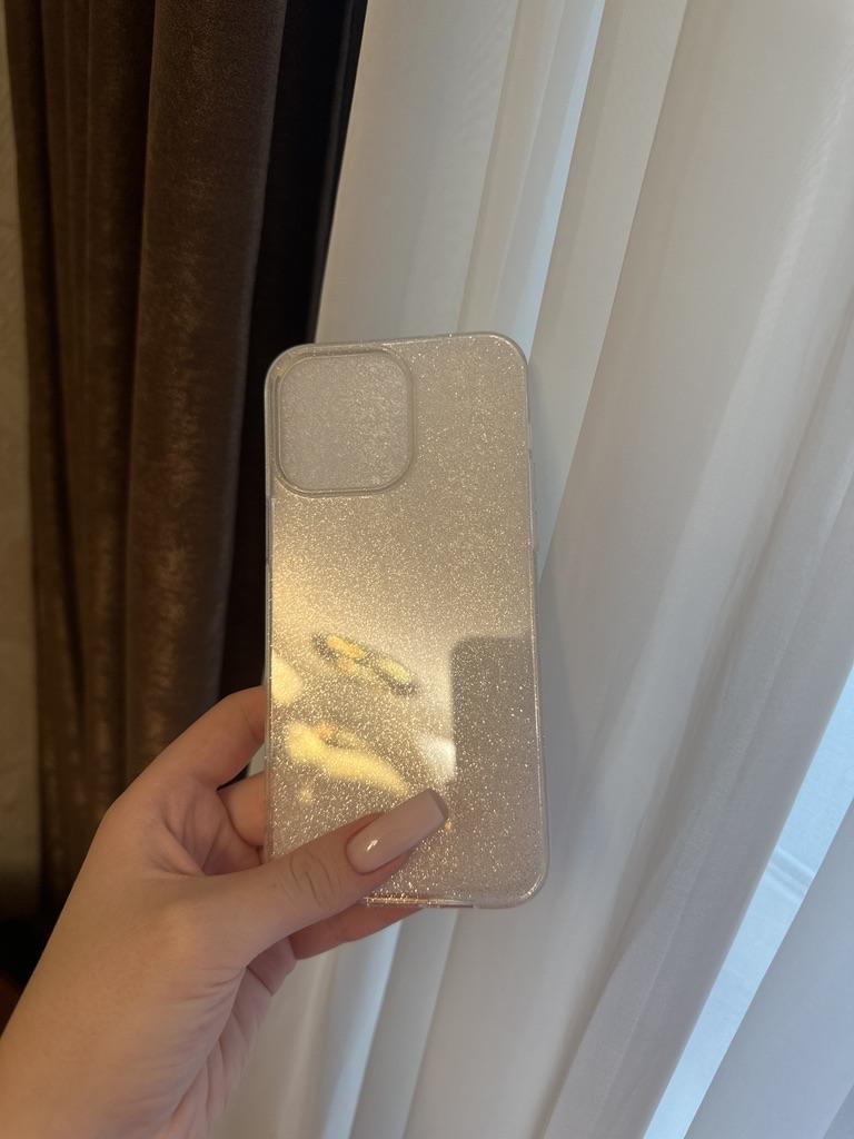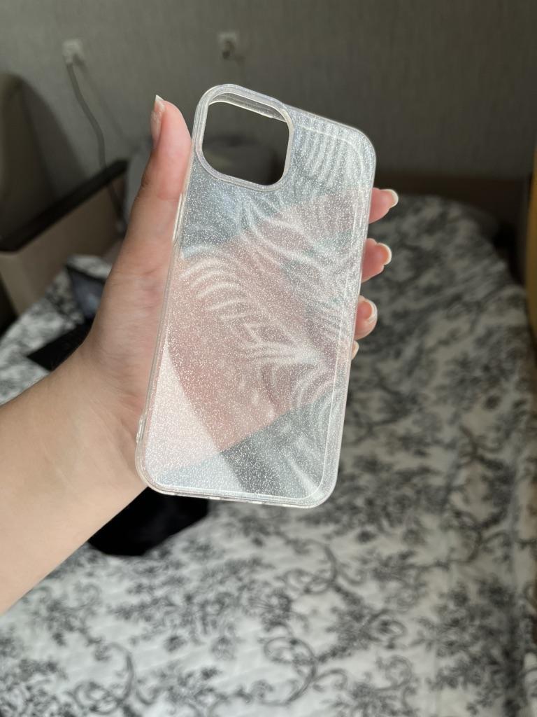 На фото заказа видно, что чехол квадратный , но пришел круглый, на фото переливается цветом, на самом деле простые блестки на прозрачном чехле