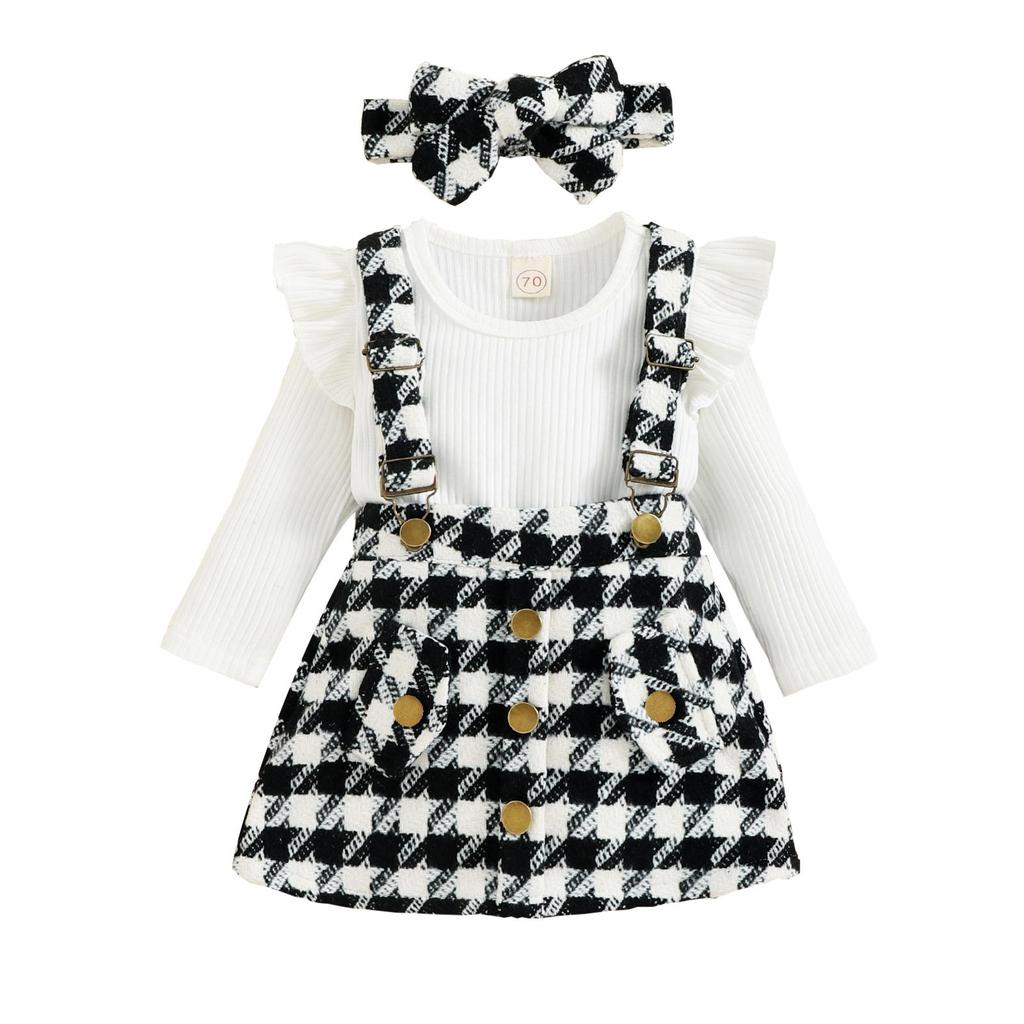 Комплект весенней одежды для маленьких девочек, однотонный комбинезон в рубчик с длинными рукавами и рюшами + юбка на подтяжках с клетчатым принтом + повязка на голову