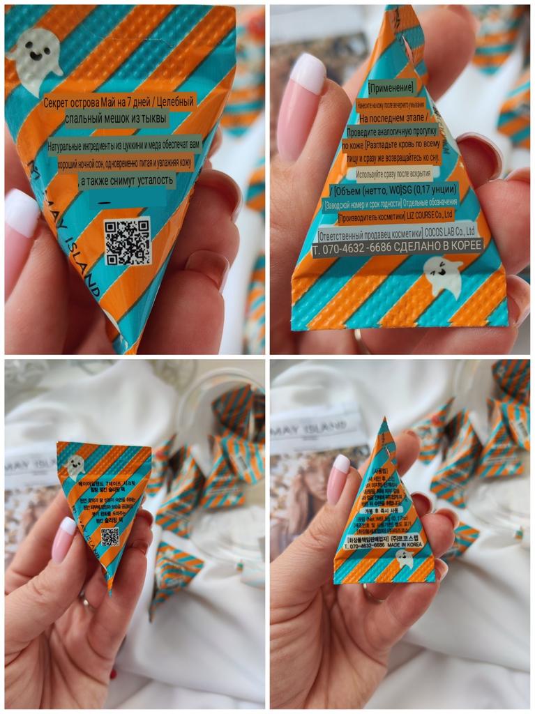 Ночная маска для лица от корейского бренда Maylsland. Обожаю эти треугольники 🥰🥰🥰. Я уже заказывала в таких треугольниках скраб для лица и гиалуроновую ампулу. Все продукты очень понравились. Маску нужно наносить вечером на лицо, а утром смыть. На коже совершенно не ощущается. Кожа после неё чистая, гладкая, матовая, отдохнувшая. В наборе 12 треугольников по 5 грамм. Мне одного треугольника хватает на 2-3 раза. Ночная маска для лица с тыквой - это отличное средство для ухода за кожей. Она помогает снять отеки, увлажняет кожу и улучшает ее текстуру. Маска содержит экстракты меда и прополиса, которые контролируют баланс масла и влаги, а также успокаивают уставшую кожу. В составе также присутствуют подсолнечное масло и масло семян тыквы, которые обладают высокой увлажняющей способностью. Кроме того, маска содержит центеллу азиатскую и экстракт корня вяза, которые успокаивают раздраженную кожу, а гиалуронат натрия и аллантоин обеспечивают подачу влаги и регенерацию клеток. Я очень довольна результатом после использования этой маски, моя кожа стала более увлажненной и сияющей. Товар рекомендую. Желаю всем удачных покупок 🤗