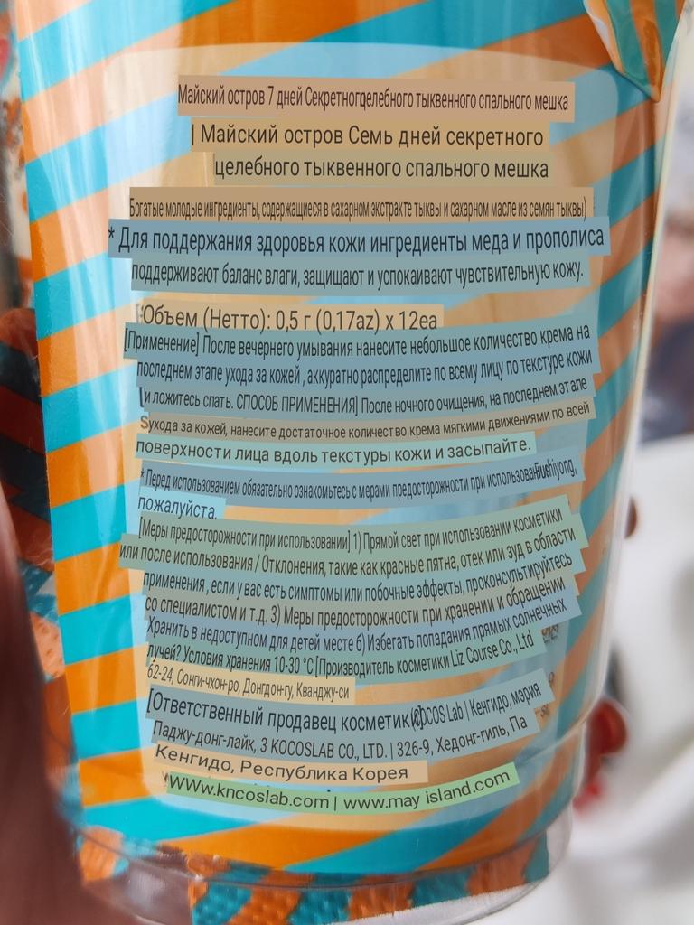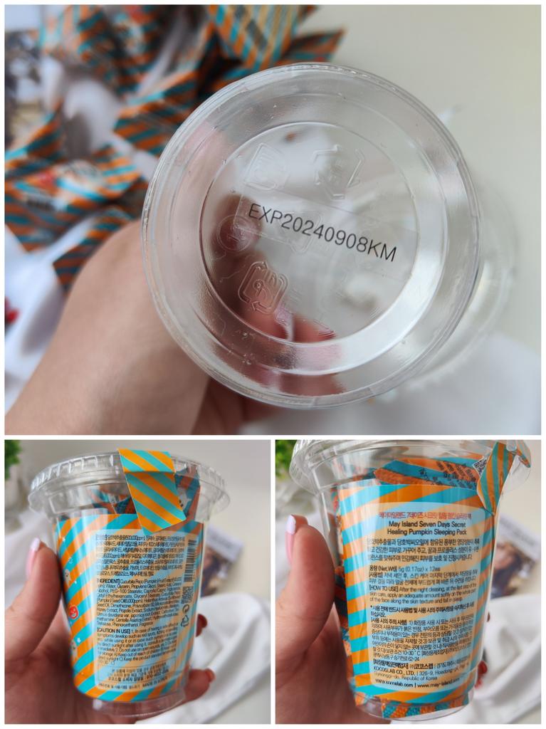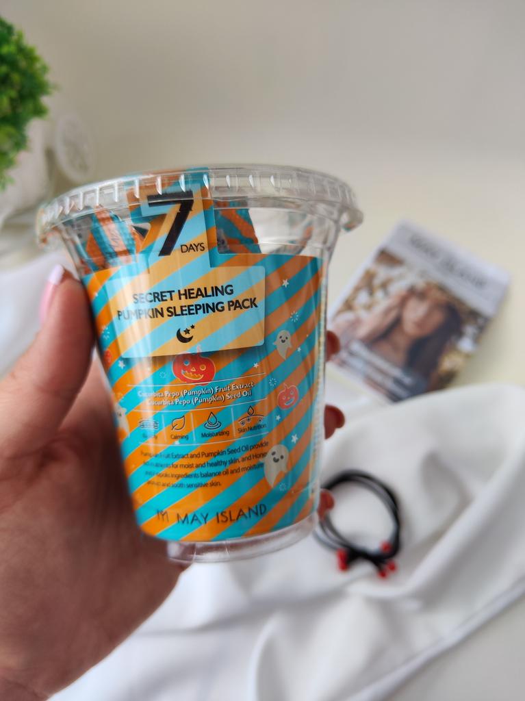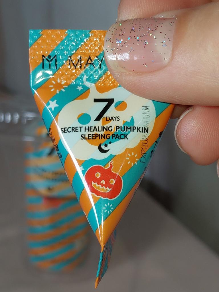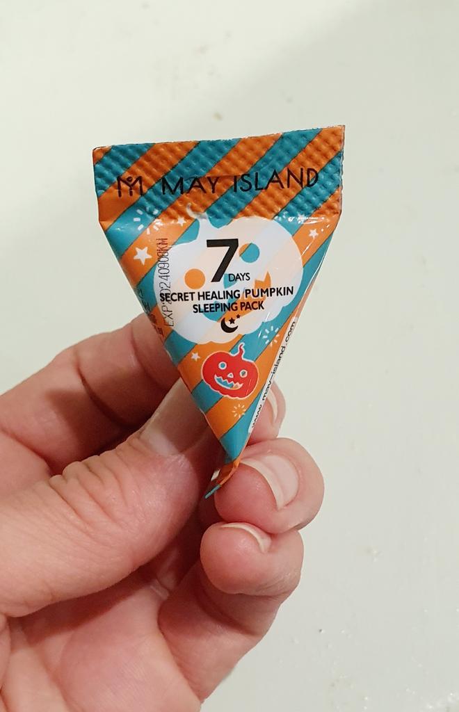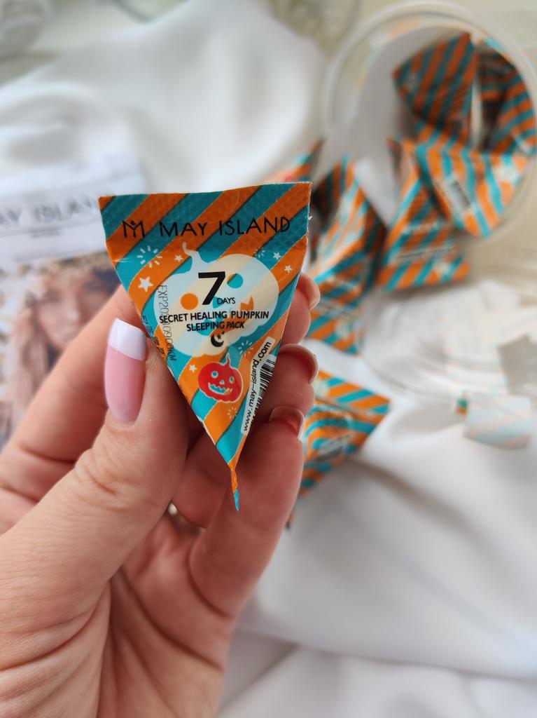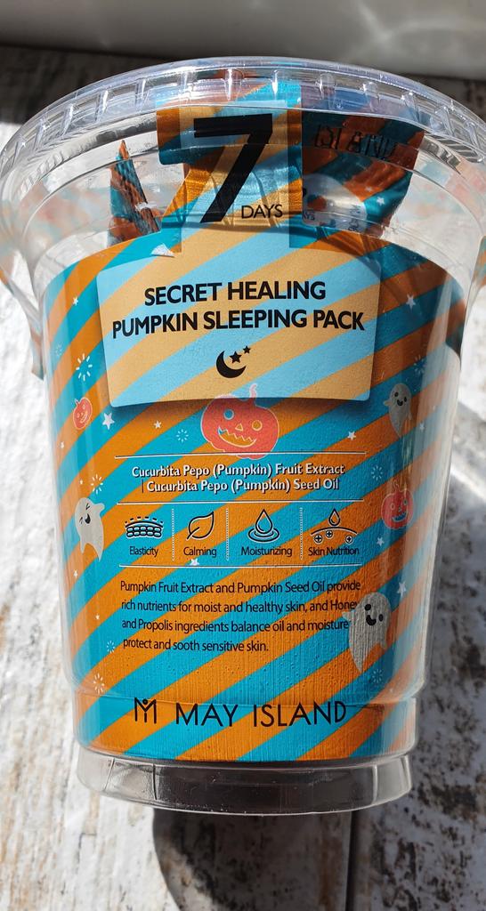 Ночная маска с экстрактом тыквы корейской фирмы May Island 7 Days Secret Healing Pumpkin Sleeping Pack (12 шт.) - работает пока вы спите. Этот увлажняющий крем гелеобразного типа, созданный на основе питательных, увлажняющих и усиливающих сияние натуральных ингредиентов, быстро впитывается, чтобы добиться заметных изменений к утру. Что делает: нормализует гидро-липидный баланс; способствует обновлению клеток кожи; ускоряет регенерацию, восстанавливает поврежденную кожу; успокаивает покраснения и зуд; борется с воспалениями; улучшает тон и рельеф кожи. В состав ночной маски с экстрактом тыквы May Island 7 Days Secret Healing Pumpkin Sleeping Pack (12 шт.) входят: Экстракт тыквы обогащен необходимыми питательными веществами для кожи, такими как, витамин А, витамин С и бета-каротин, которые мягко отшелушивают и удаляют омертвевшие клетки кожи. Обеспечивает увлажнение, поддерживает эластичность и оказывает успокаивающее действие. Экстракт центеллы азиатской - успокаивает болезненные воспаления кожи, ускоряет заживление ран и улучшает кровообращение. Первый раз использовала одну штучку целиком! Средства оказалось очень много. Хватило нанести жирным слоем на лицо и шею, и ещё осталось, нанесла на зону декольте! В следующий раз решила использовать только половину, на лицо вполне хватает. Имеет лёгкий, очень приятный запах. Маска немного ощущается на лице даже утром. Для подобных средств это нормально. Данные средства рекомендуется использовать 2-3 раза в неделю. Я планирую использовать раз в 3 дня. Если кожа проблемная можно использовать курсом каждый день! Срок годности указан на каждой мини упаковке.