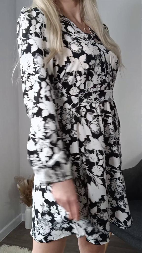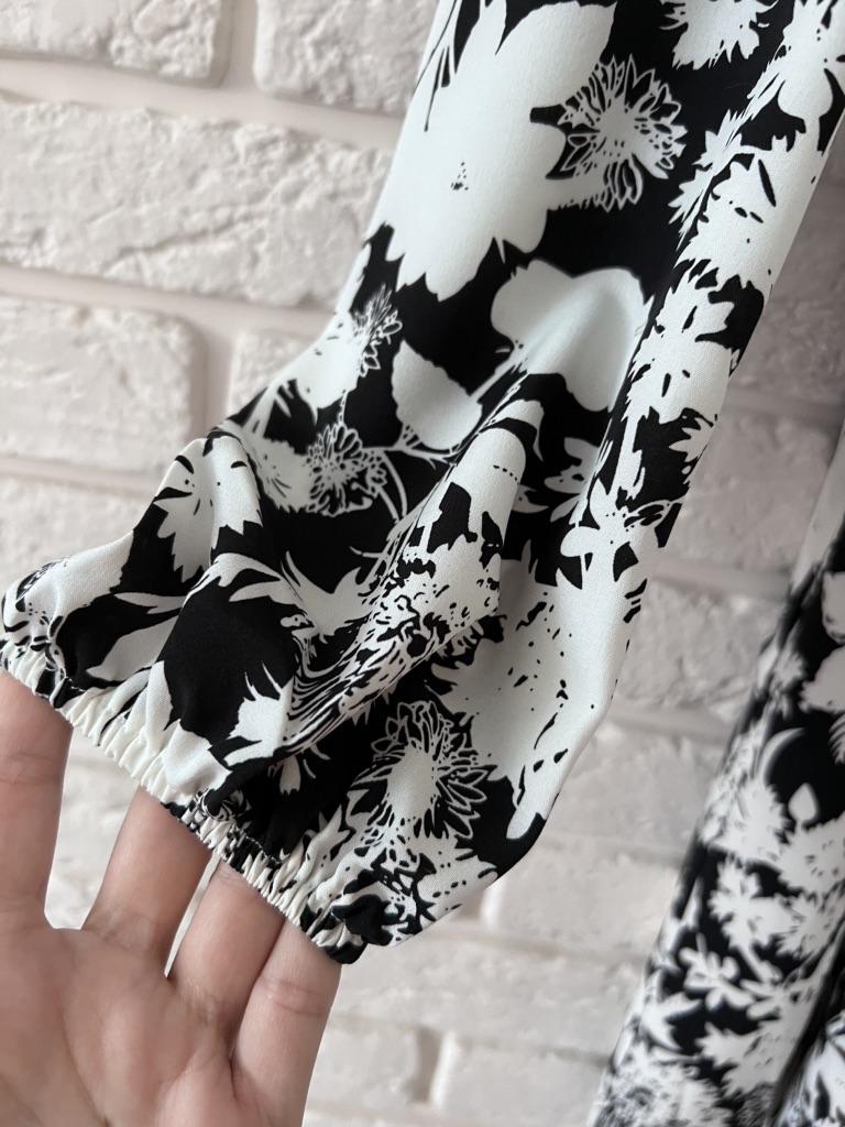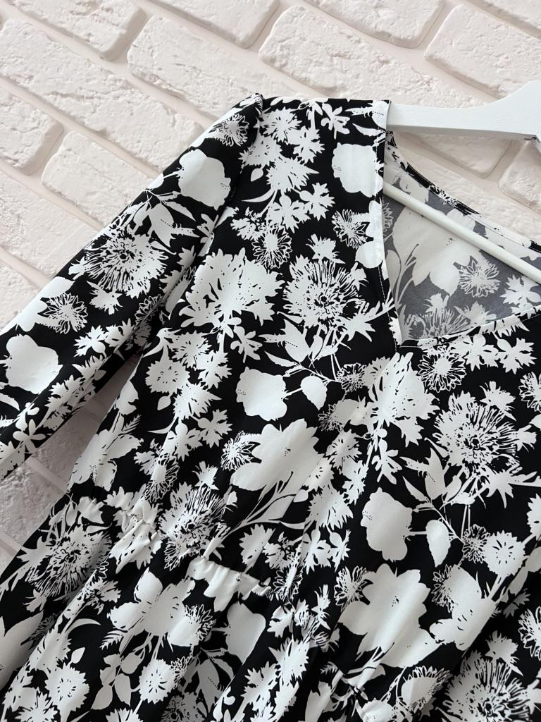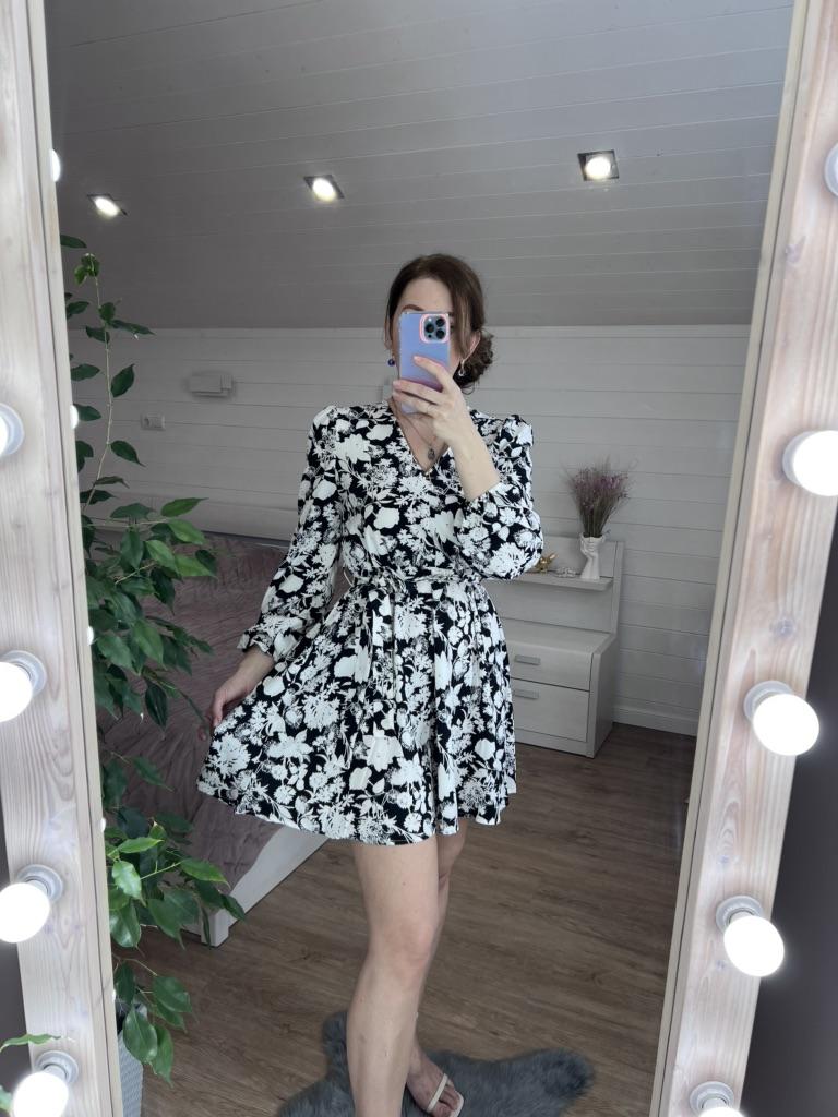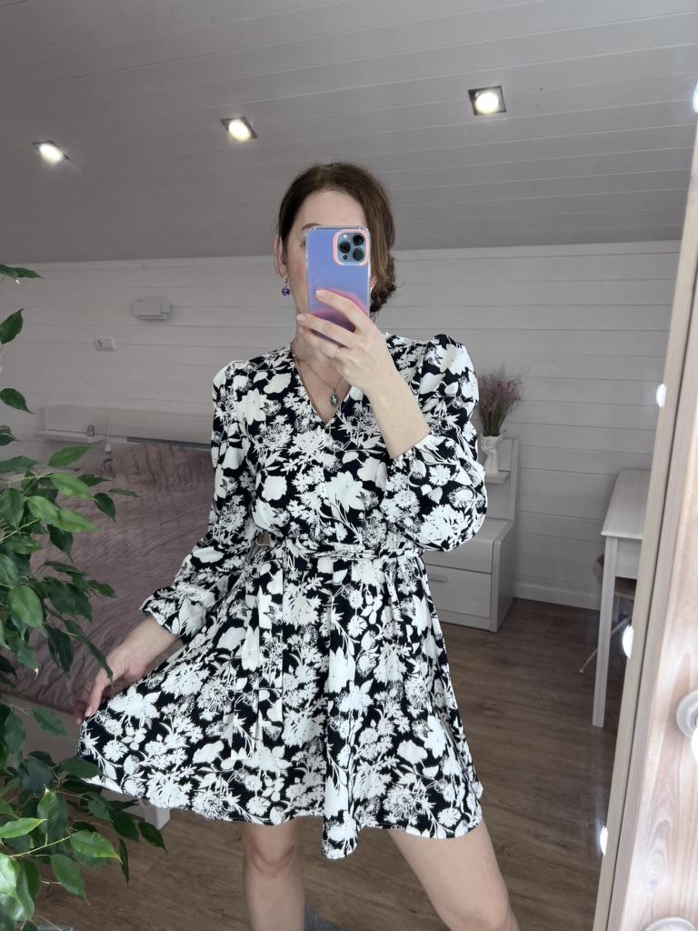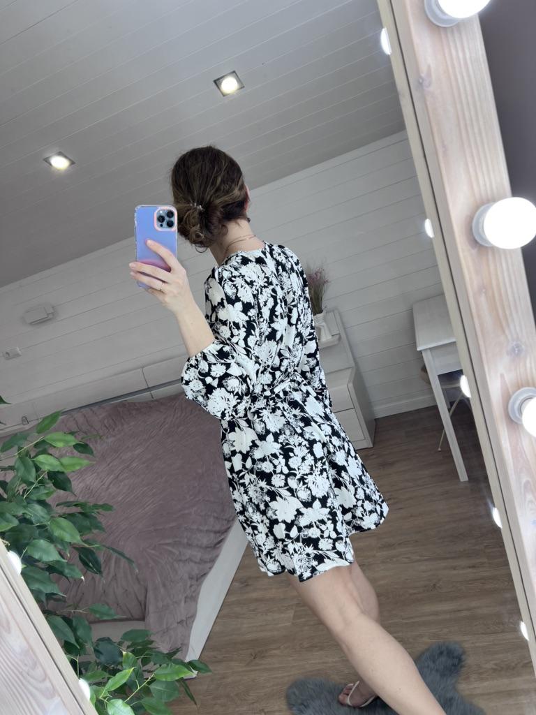 👗Потрясающее платьеце😍👌 Цветочный чёрно белый принт Полиэстер 100%,но очень приятный а главное не прилипает к телу. На мои параметры 90-76-98,рост 154 в размере М село идеально 👗Ничего переделывать не надо. Пошив отличный Вырез в зоне декольте отличное,не пОшло Материал почти не мнётся да и не видно даже на фоне этих цветочков 👗Гладится легко Рукава длинные в меру,на резиночке,не давят На талии тоже резинка, тянется Есть поясок длинный на шлейках Можно завязать как спереди,так и сзади 👗Платье хоть куда И для вечерних прогулок тоже отличный вариант Однозначно рекомендую 👐 Спасибо продавцу и Джум 🤗