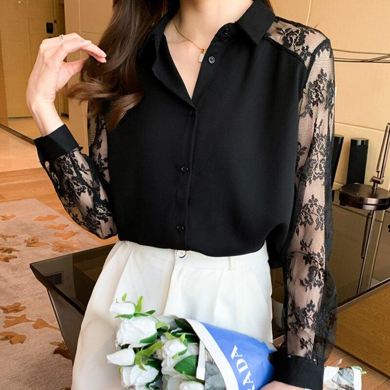 Модный полый воротник-поло, топ, кардиган, блузка, осенняя шифоновая рубашка с лацканами и кружевом, женские элегантные базовые блузки, женские 16623