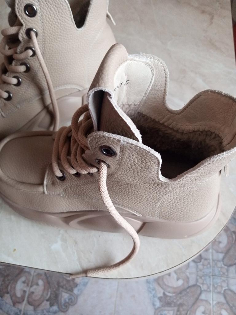 👍Хорошие ботинки, качество отличное! 👍На совесть упакованы, не помялись, без заломов и прочих неприятностей при транспортировке. 📌По отзывам купила на размер больше. Но смело можно заказать свой, если нога узкая. 📌Сверху кожа, внутри искусственный мех, как и заявляет производитель. 📌Несмотря на объёмную подошву, не тяжёлые. И смотрятся вполне прилично и аккуратно. Я уже покупала обувь этой фирмы. Были какие-то огрехи. Но эти ботинки 🥾 - лучшее, что я купила на «Джуме "👍👍👍