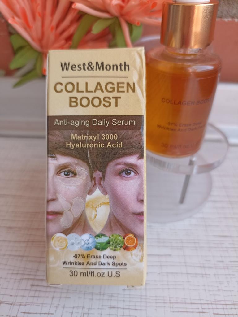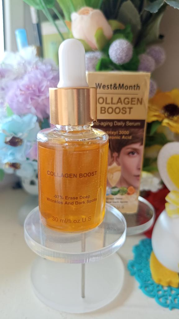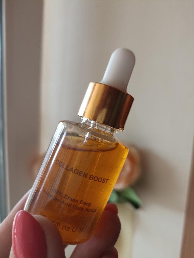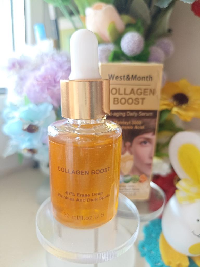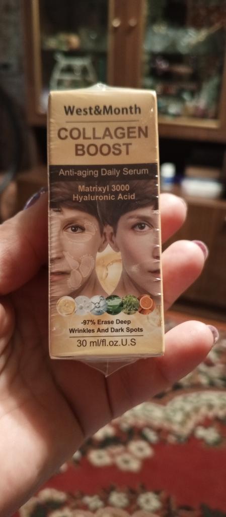 Антивозрастная сыворотка с коллагеном , 30мл. В составе гиалуроновая кислота , глицерин , экстракты гамамелиса , солодки , морских водорослей , зелёного чая , семян жожоба.. Пластиковая бутылочка с пипеткой дозатором . Сама сыворотка золотистого цвета , гелеобразной консистенции с приятным цветочным ароматом . Срок годности 3 года Для всех типов кожи Наносим утром и вечером на предварительно очищенную кожу , массируем до полного впитывания . Впитывается быстро , не оставляя липкости и жирных следов . Ощущения более чем приятные. Увлажняет , питает, успокаивает кожу , есть лёгкий эффект лифтинга . Доставка в течении месяца , упаковка хорошая , продавцу спасибо за интересный товар .