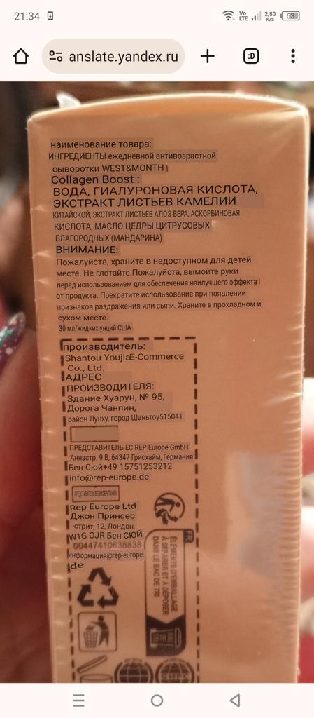 Сыворотка очень интересная 🔥 Впитывается хорошо 👍 Морщинки мелкие разглаживает, Освежает кожу лица, Запах отдалённо лёгкий 💕 За 263 ₽ купила первый раз🍀 Покупаю 3 товара сразу И скидка для меня ощутима🙏🤫 Есть срок годности 👌 Но думаю буду брать ещё 💕☝️ Перевод смотрите на фото👇 Коробочка пришла запаяная В полиэтилен. В хорошем состоянии 👍🤗