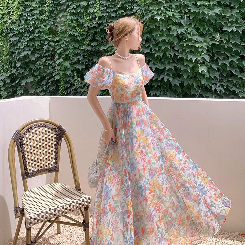 Летнее женское длинное платье феи с цветочным принтом и цветочным принтом из органзы с пышными рукавами и повязками, стильное пляжное дорожное платье — купить товар онлайн с бесплатной доставкой до всему миру!