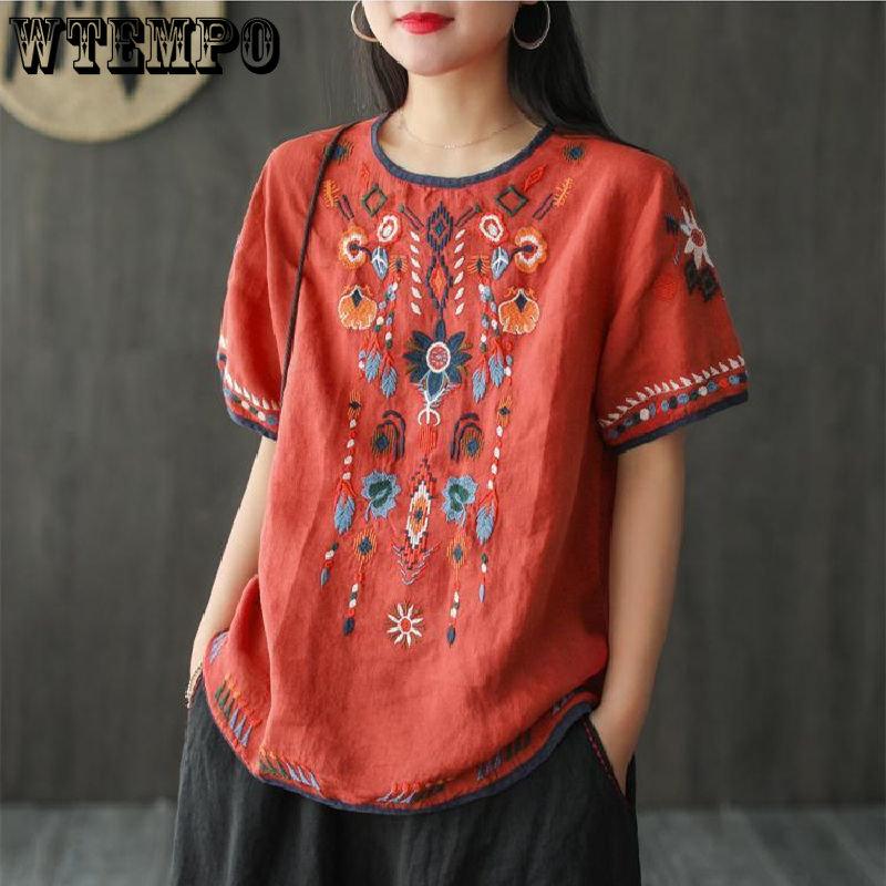 Летняя женская футболка больших размеров M-4XL с короткими рукавами, блузка с круглым вырезом, свободная мода, винтажная вышитая в национальном стиле, женские топы, повседневные рубашки с принтом