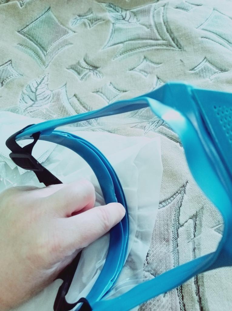 Маска маломерка, плохо что не указаны размеры , длины, ширины, глубины. Стекло пластиковые без жесткой фиксации, имеет небольшие следы повреждения в виде царапин с внешней стороны. Контур ободка из плохого качества резины, через год рассохнется и будет трескаться. Имеет деформацию по линии фиксации пластикового стекла. Удерживающие и фиксирующие затылок резинки, небольшой длины. Фильтрующий элемент, расположенный в в нижней части у подбородка, даже без вашего участия, самостоятельно может выпадать. Как располагать фильтрующие пластинки, пришедшие в комплекте, большой вопрос, т.к. фиксаторы жестко удерживают крышку контейнера воздуховода и места расположения фильтрующего элемента!