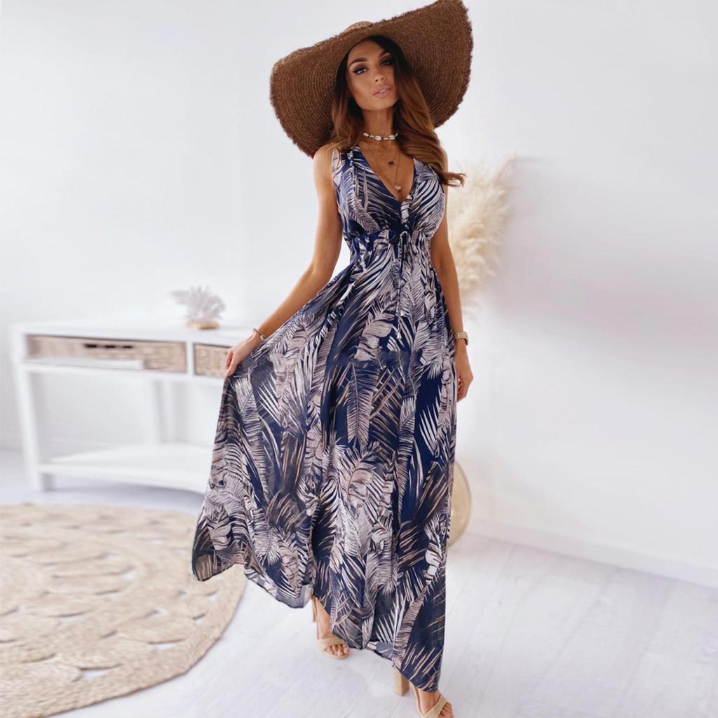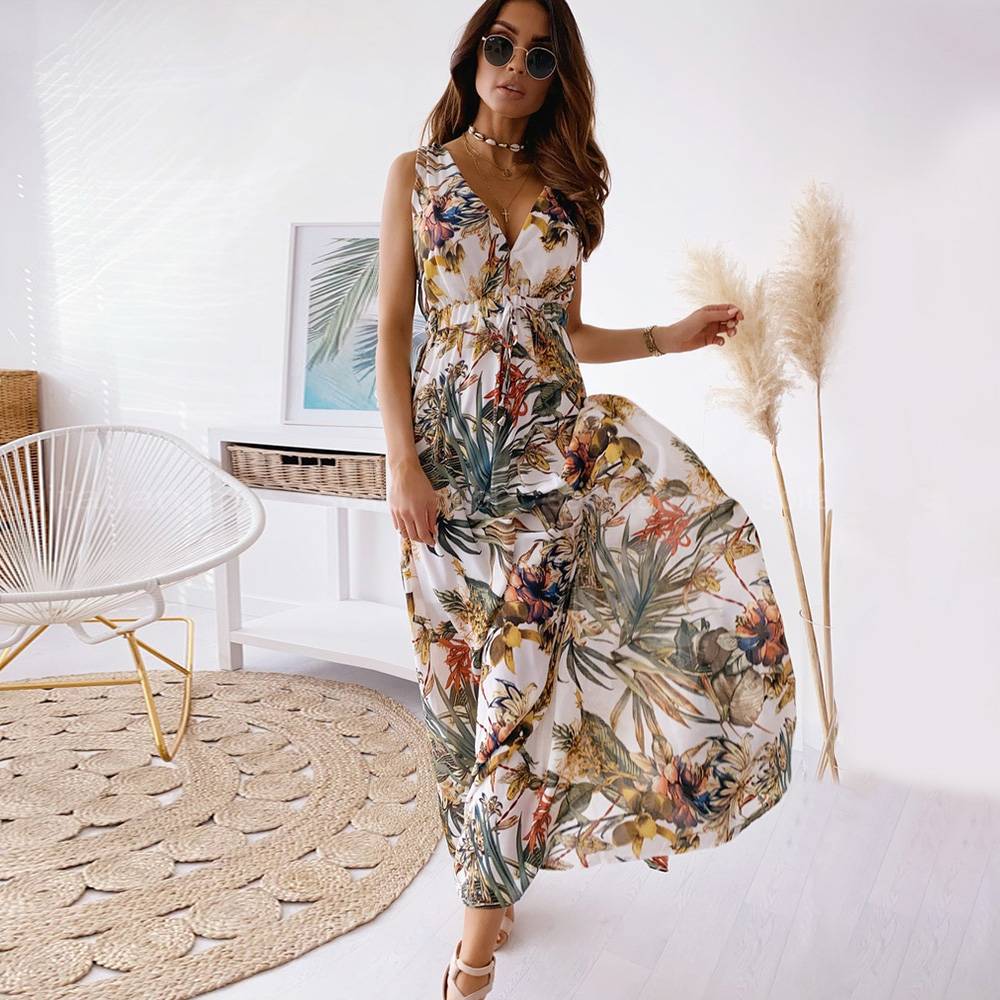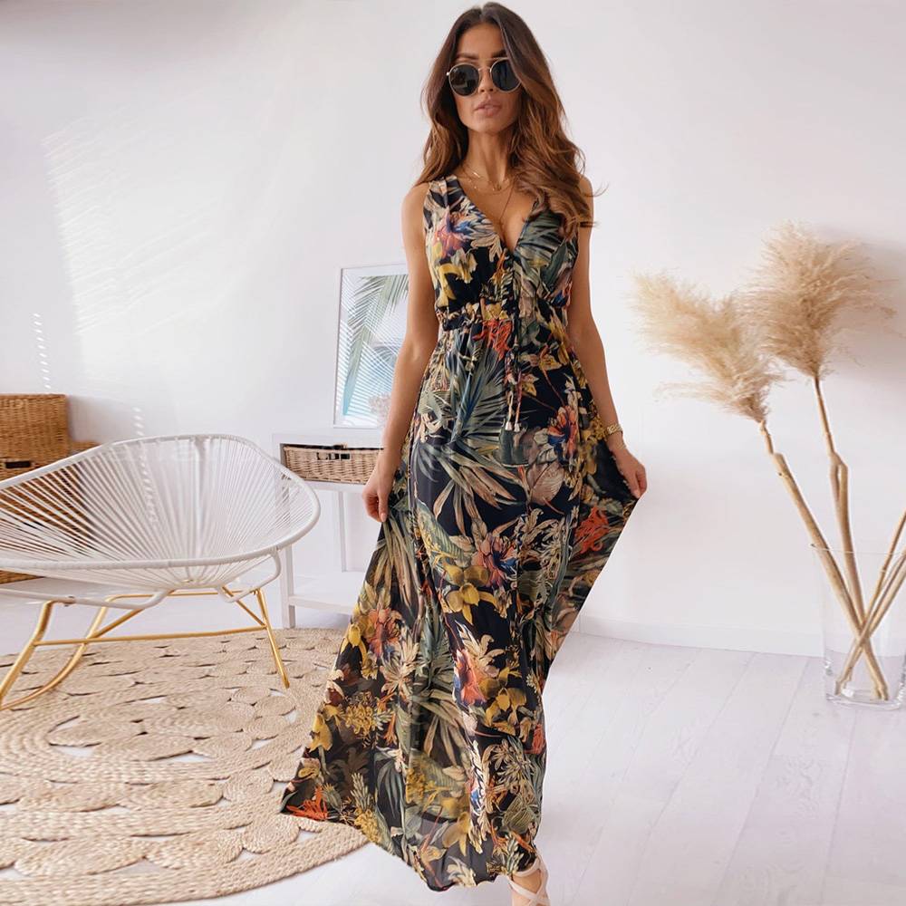 Женское летнее длинное платье макси с цветочным принтом в стиле бохо и V-образным вырезом, женский праздничный сарафан