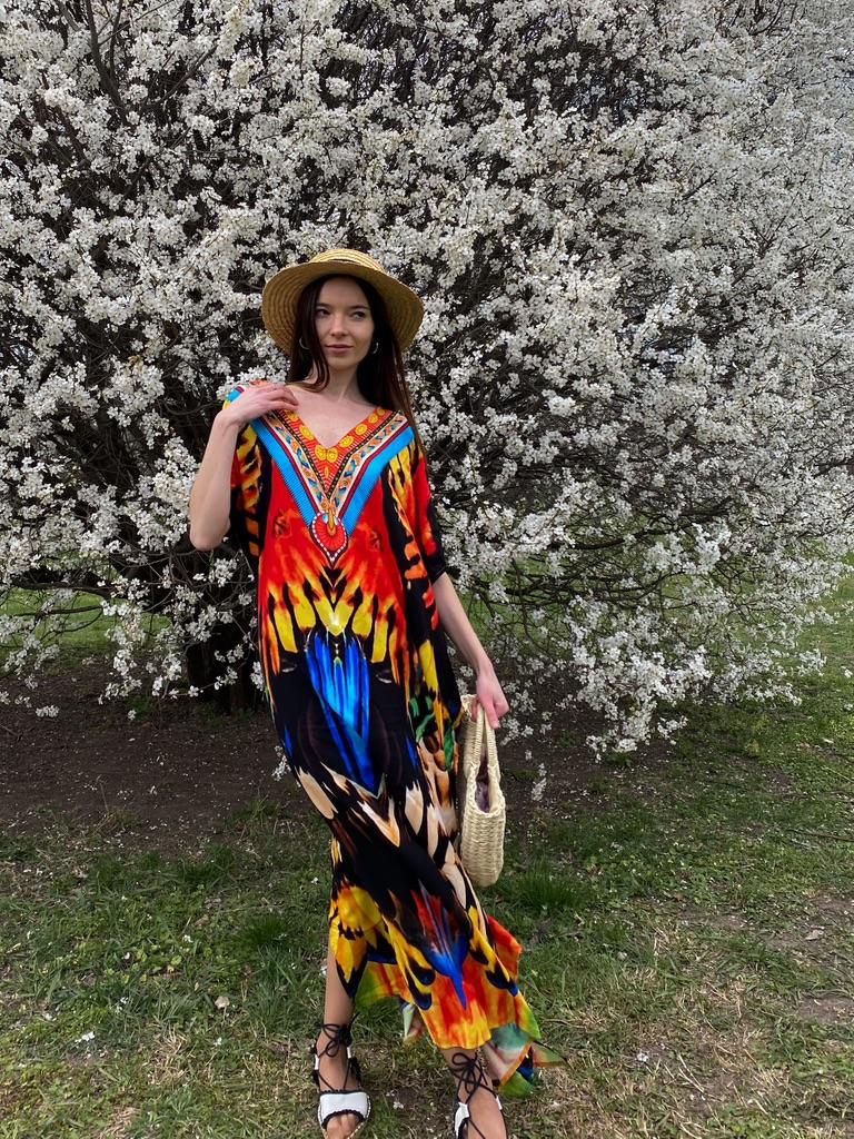 Длинное платье-туника На параметры 84-60-85 , рост 167 см , единый размер сидит идеально , длина хорошая -до пола. Ткань гладкая, лёгкая и приятная к телу . Спереди платье имеет декольте. Рукава широкие. Сбоку разрез. Я довольна, вещь нежная, женственная и привлекательная. Советую.