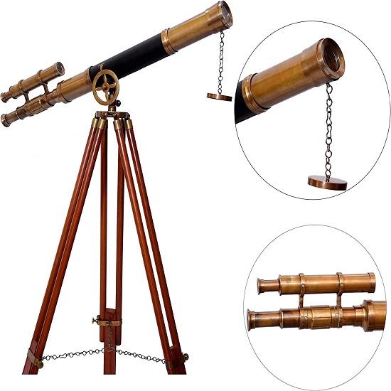 Деревянная подставка для штатива оснащена деревянными круглыми ножками, каждая из которых имеет твердые латунные фитинги и винтовой фиксатор, позволяющий регулировать высоту, а латунная цепь удерживает три деревянные ножки вместе, чтобы телескоп мог сохранять свое положение.