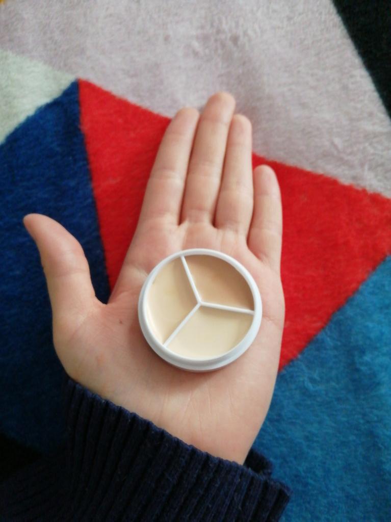 Из плюсов: ТРИ СУПЕР ЦВЕТА ПОД ЛЮБОЙ ТОН🥺🌹 мне на бедную кожу подошёл идиально!! Правильно написано что "безупречный" ❤️ Безумно рада! Тон нежный, на коже не чувствуется, не крошится и при любых обстоятельствах почти не стирается! К минусам: Маленький объём :( Если честно я думала что баночка будет примерно с ладонь, и более плоская, но на самом деле это не особо то и мешает, главное что цвет подошёл, хе