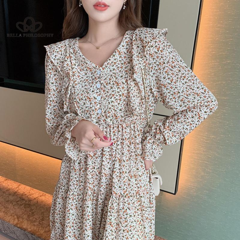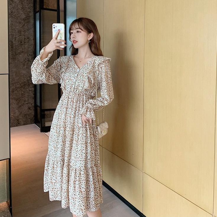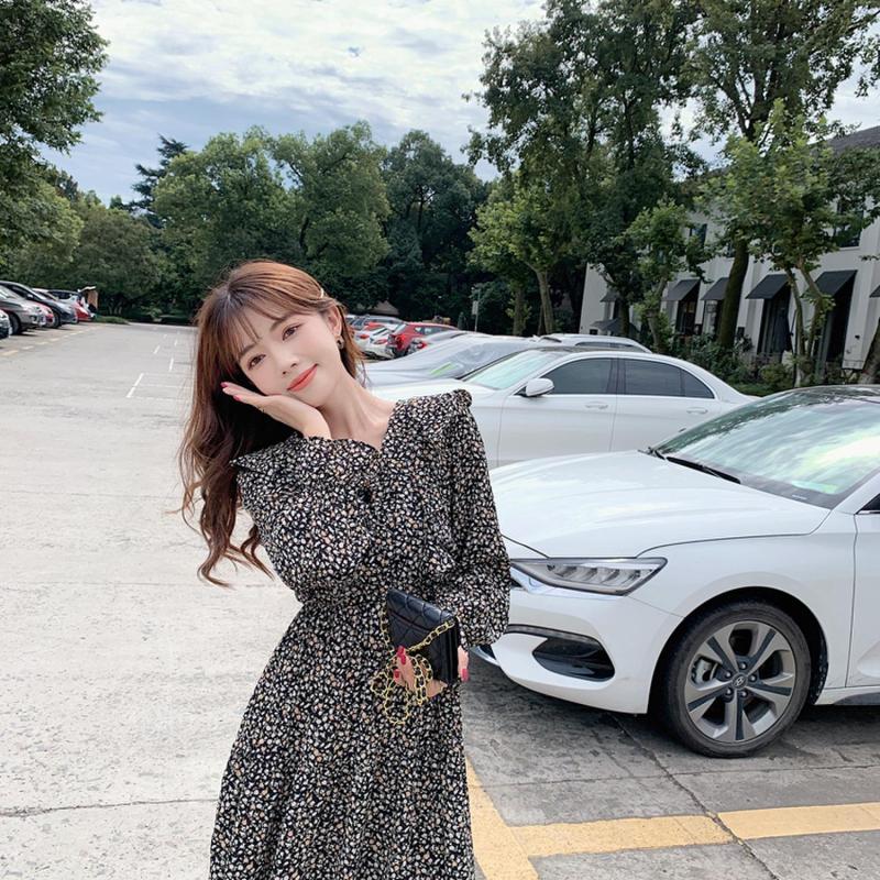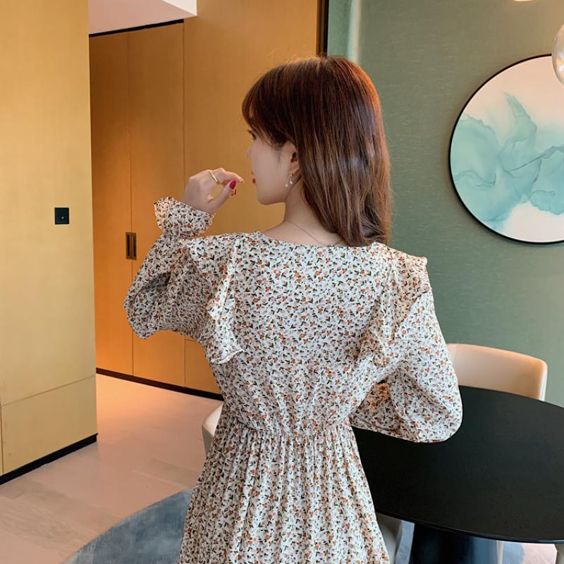 Весеннее корейское женское маленькое красивое шифоновое платье с v-образным вырезом и длинными рукавами, летнее повседневное платье с принтом