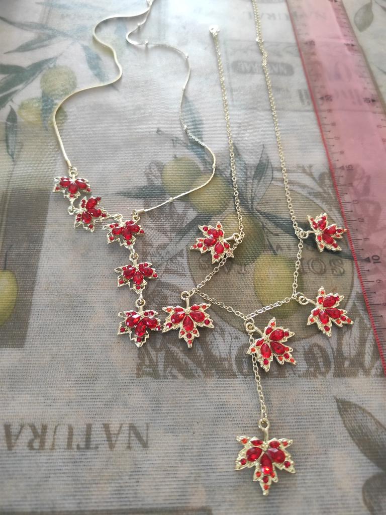 Шикарное колье листья чуть больше рублёвой монеты. Яркие на солнце горит рубином .в сравнении 2 колье монеты 1 рубль.