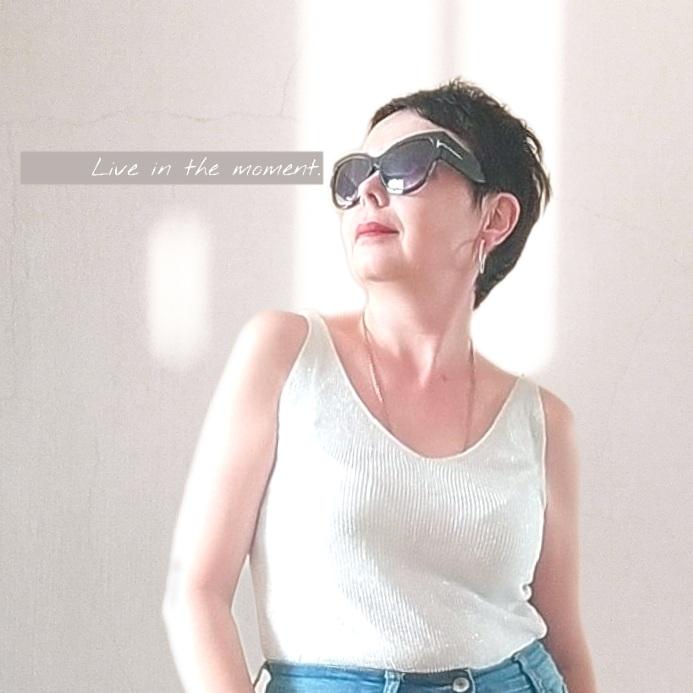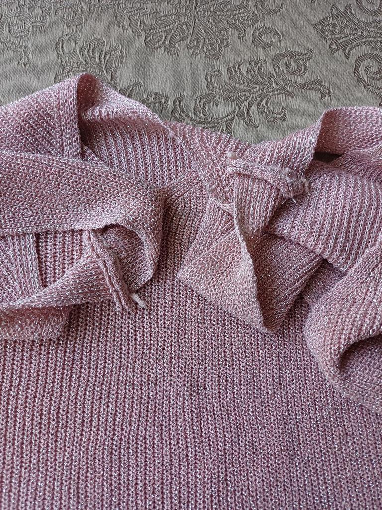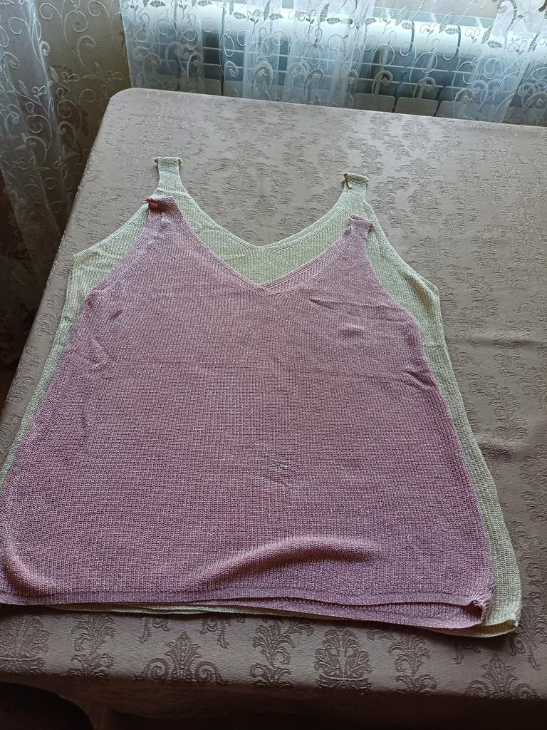Трикотажная маечка с люрексом. Заказала размер L, на мои 96-74, свободно. Вырез маечки, впереди и по спинке одинаков. Трикотаж рыхлый, лёгкий, чуть просвечивает. Такая маечка хороша на лето, или под жакеты. Цвет светло-серый, серебристый. Из минусов, бретели стачены оверлоком, шов оверлока выходит за пределы бретели. Обрезать опасно, приходиться закрепить внутрь. А в целом всё нормально. Бюджетная маечка, всегда пригодиться.