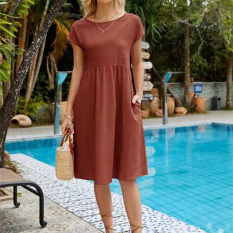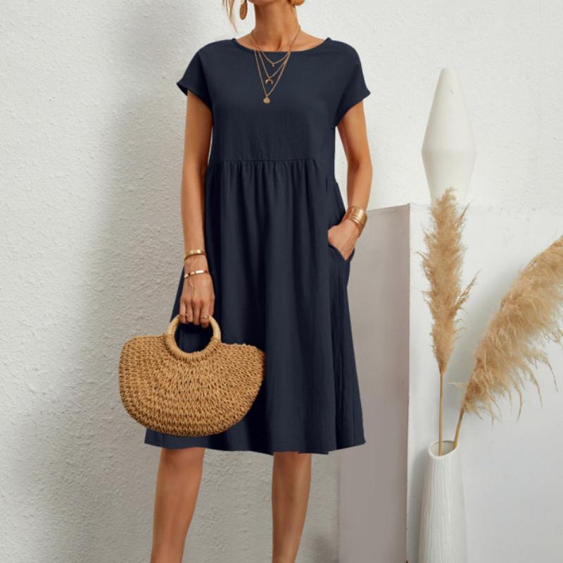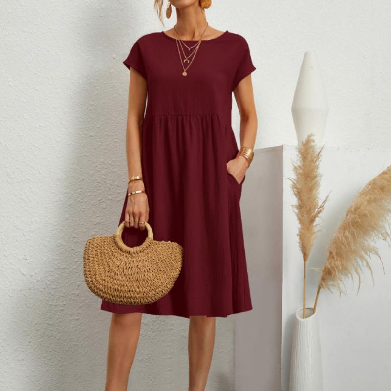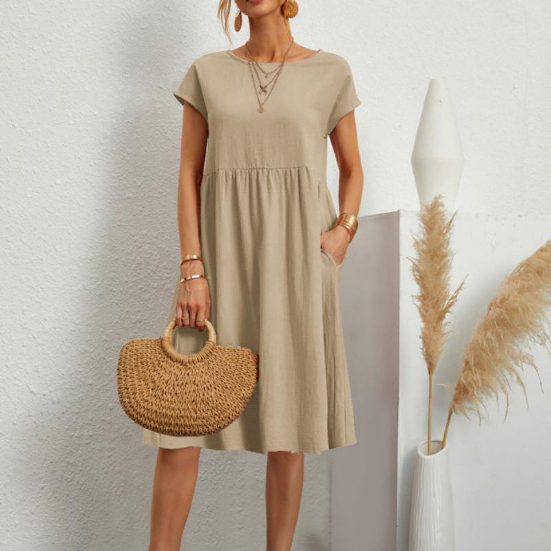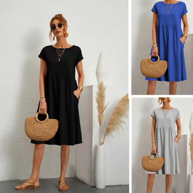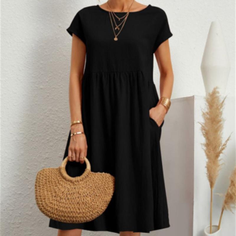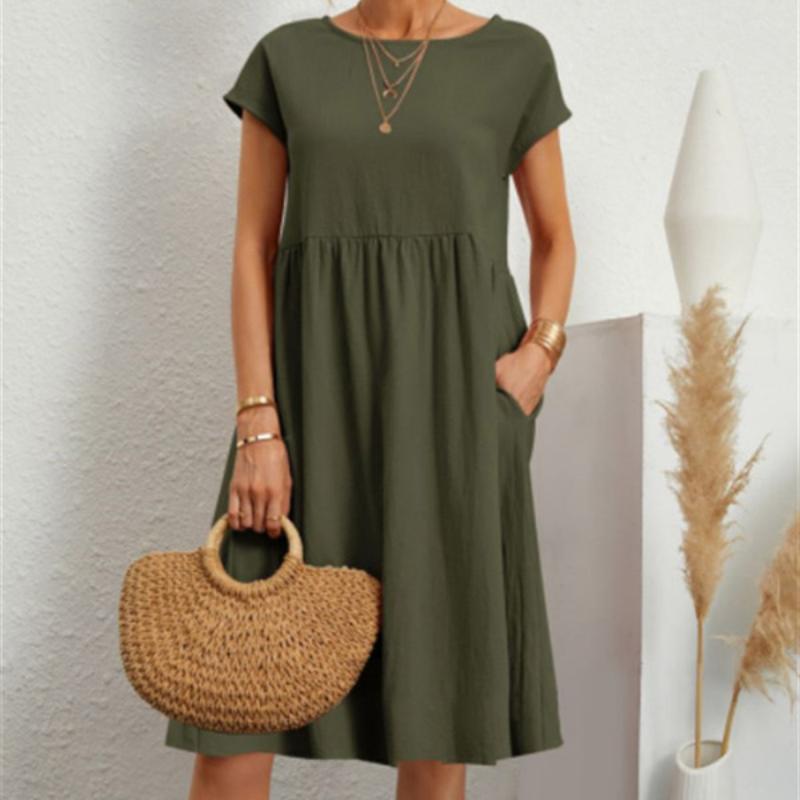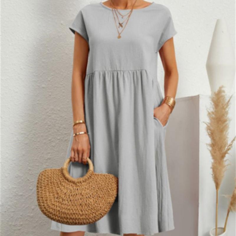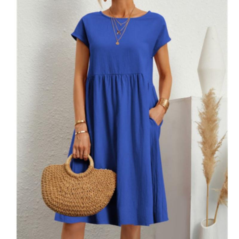 Весенне-летние женские хлопковые льняные платья большого размера, однотонное повседневное платье с коротким рукавом и круглым вырезом
