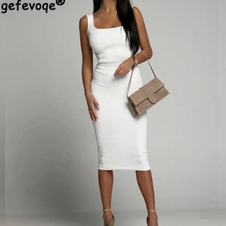 Летнее модное вязаное в рубчик простое черно-белое облегающее клубное платье без рукавов, базовое платье миди для женщин, повседневные элегантные сексуальные женские платья