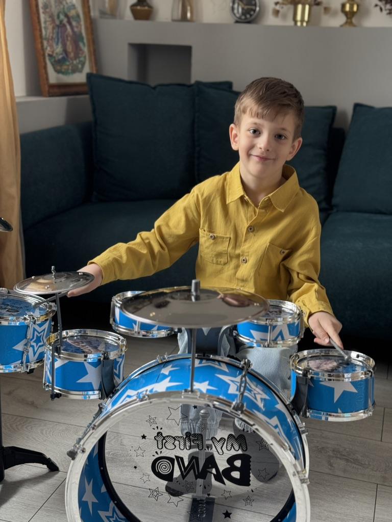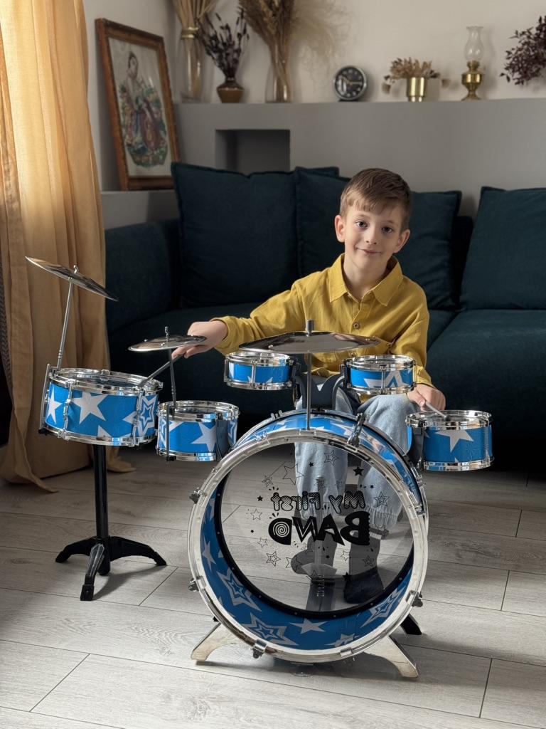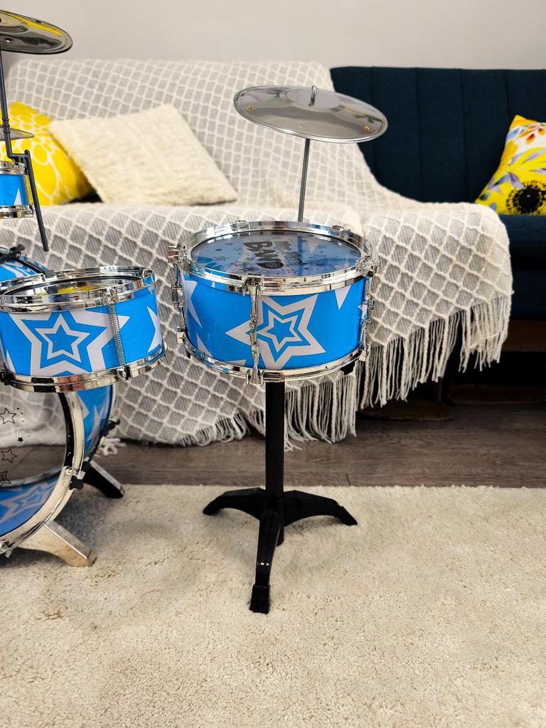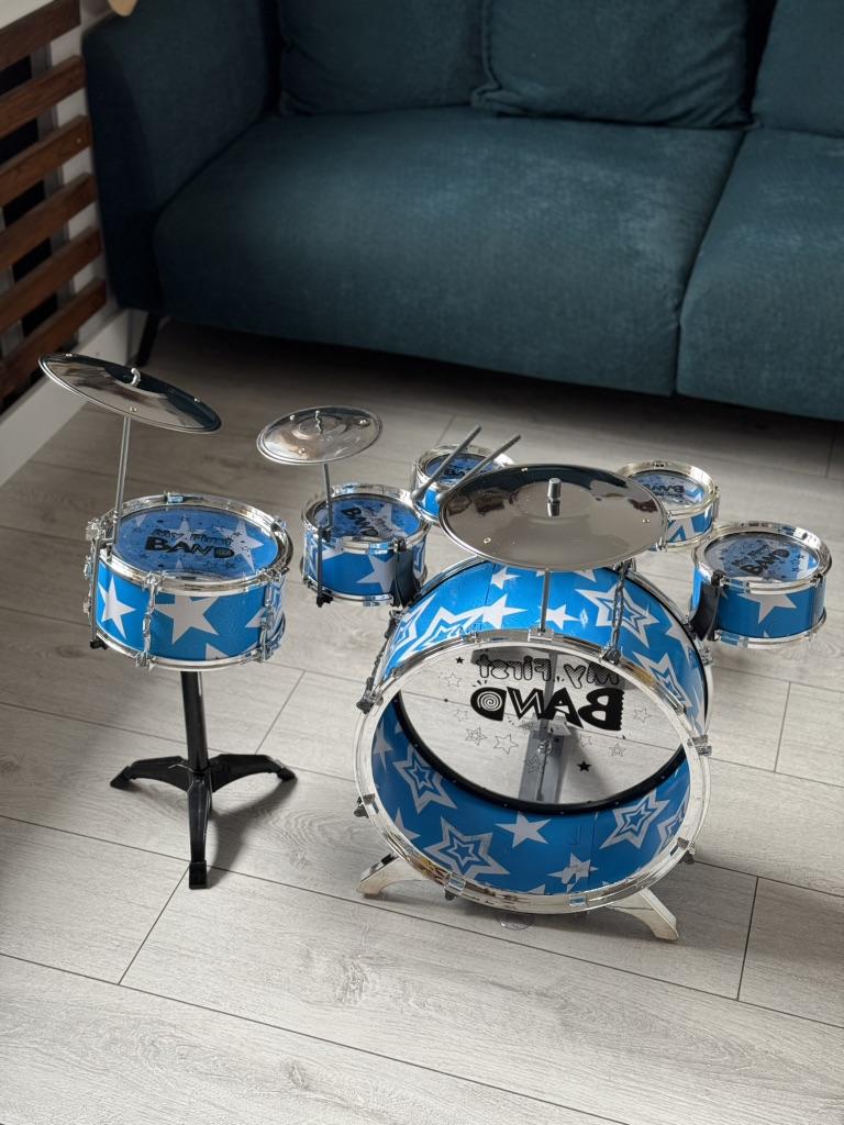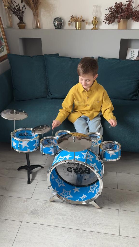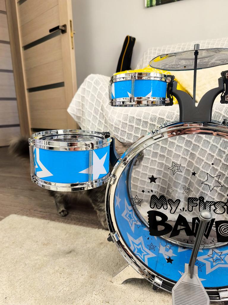 Барабанная установка выглядит ярко и привлекательно, идеально подходит для начинающих музыкантов. Она компактная и удобная для использования в домашних условиях. 🔸Название "My First Band" указывает на то, что это установка для детей, делающих первые шаги в музыке. 🔸Барабаны выполнены в синем цвете с белыми звездами, что делает их яркими и привлекательными для детей. У продавца есть ещё в красном цвете. 🔸Установка состоит из нескольких барабанов разного размера, тарелок и стула. 🔸Материалы безопасны для детей. 🔸В комплекте идут барабанные палочки. Цена = качеству Ставлю ⭐ ⭐ ⭐ ⭐ ⭐ Большое спасибо продавцу ❤️ и Joom ❤️