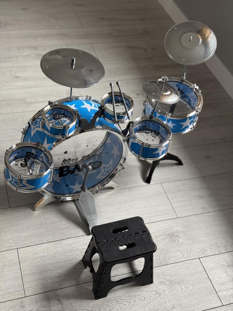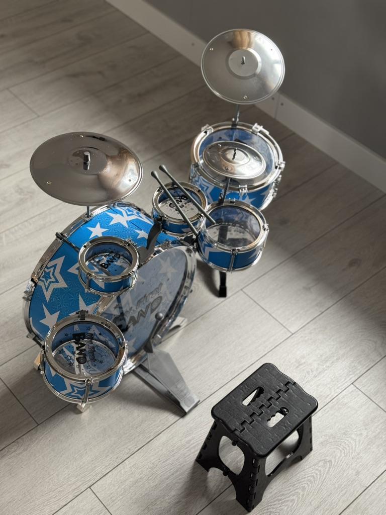 Детская барабанная установка 🔥🔥🔥 Понравится каждому юному музыканту. Игра на игрушечном барабане развивает артистические способности, чувство ритма, мышечные рефлексы и тренирует физическую выносливость, ловкость и сноровку. Сын очень доволен, играет часто в своей комнате. Идёт в комплекте со складным стульчиком. Стул достаточно прочный, сына 20 кг. выдерживает отлично. Детские игрушечные барабаны легко собираются и разбираются, занимают мало места в разобранном виде. В комплект входят музыкальная ударная установка, табуретка и палочки. Табурет разбирается. Приходит в большой коробке, такой детский игрушечный музыкальный инструмент станет замечательным подарком детям. Доехал в целости, единственное две стяжки для большого барабана повреждены, но это не критично, без двух штук и так всё хорошо держится. Доставка около месяца. Трек-номер отслеживался. К покупке рекомендую 🔥