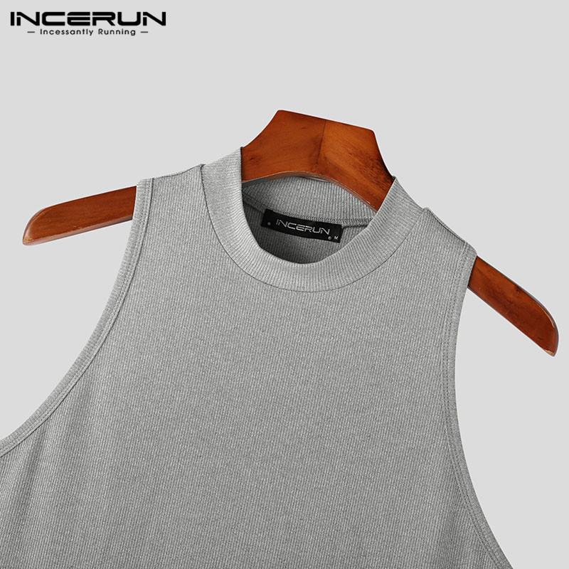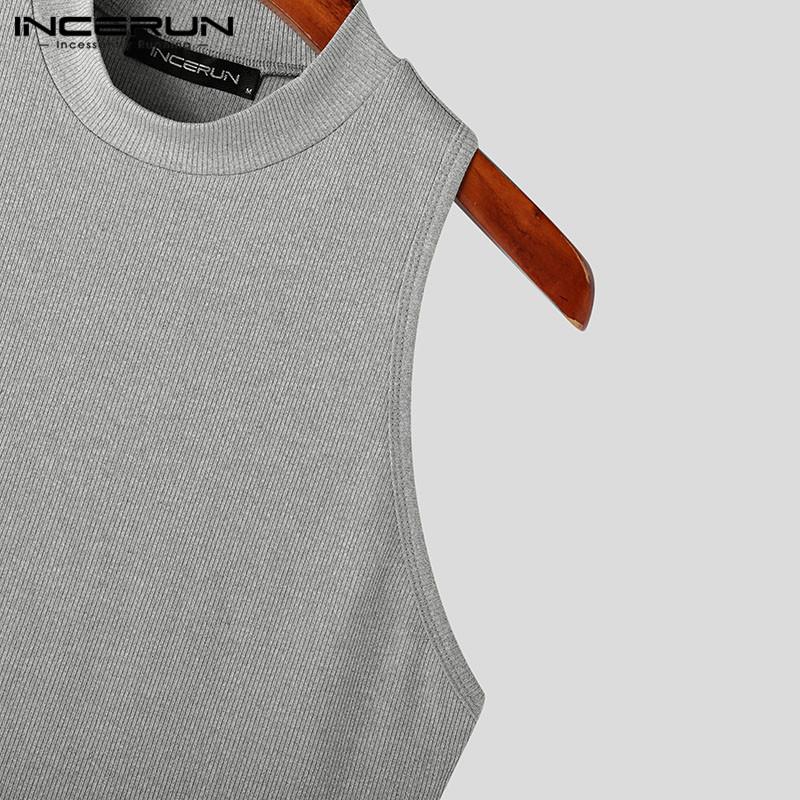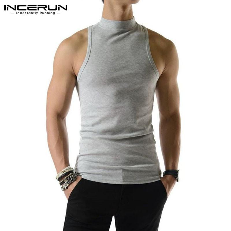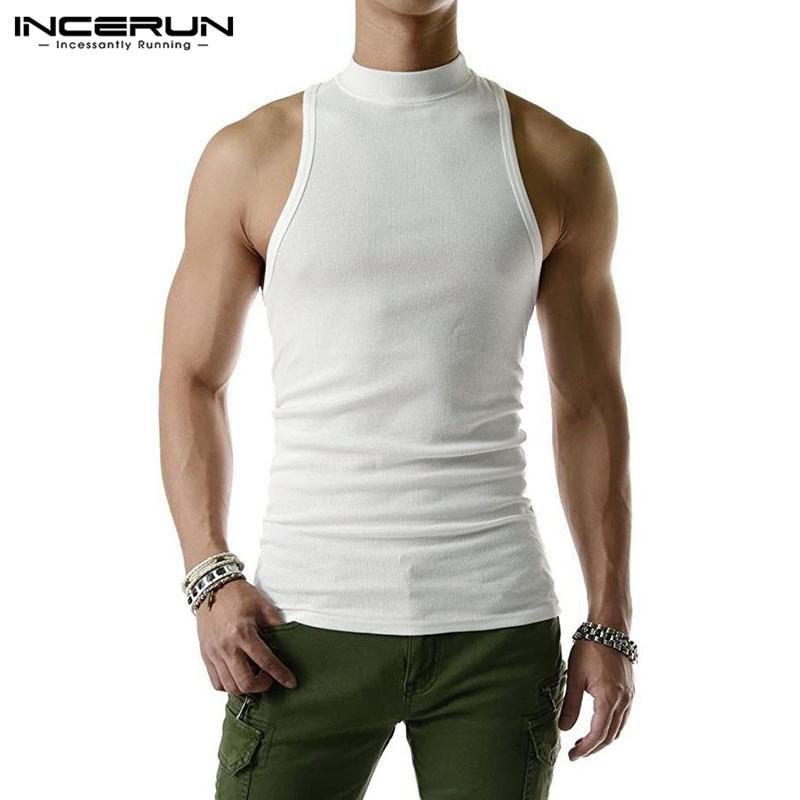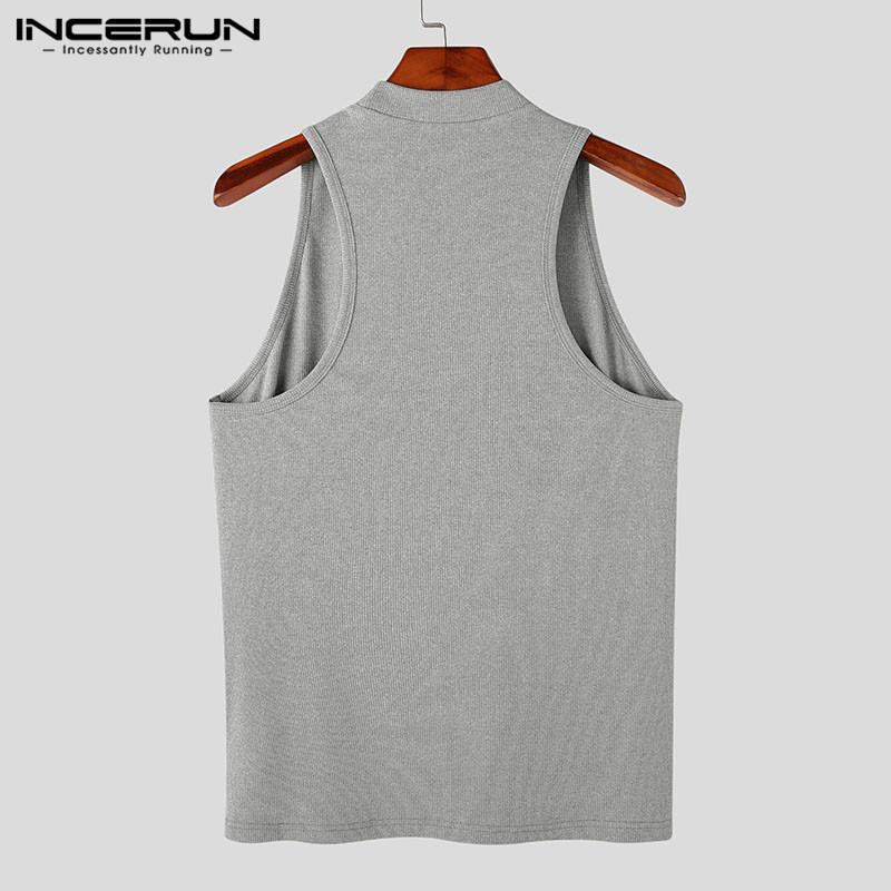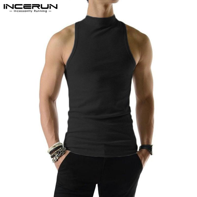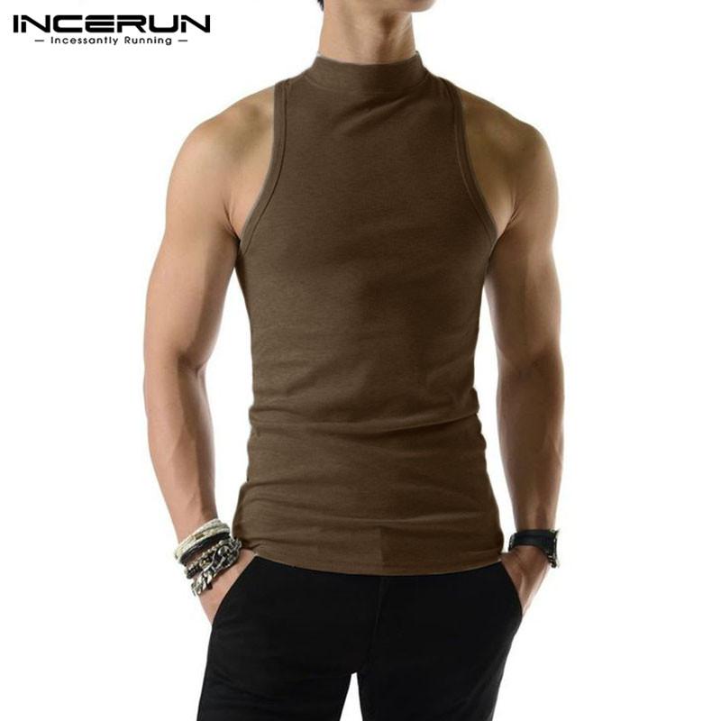 INCERUN Летние мужские облегающие однотонные топы без рукавов с полуворотником