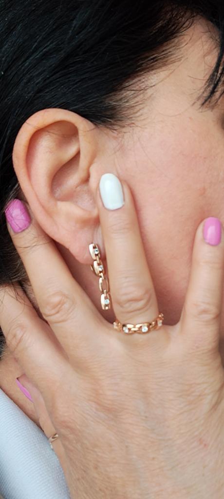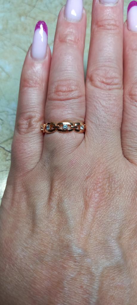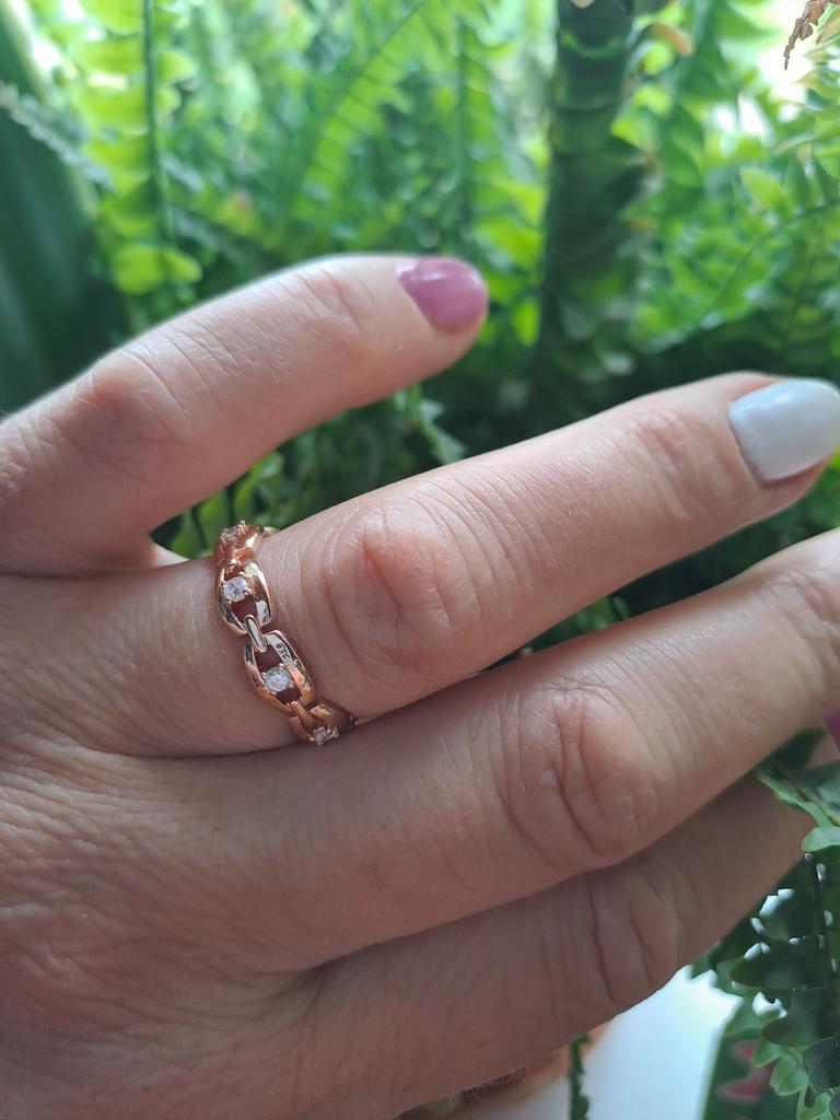 Красивое, изящное кольцо!👌💥 Материал:медь, искусственный циркон, покрытие из розового золота ☝️💯💥 Кольцо выполнено в виде цепочки, смотрится замечательно за счёт сверкающих камушков 👍💥💥💥 Кольцо брала под серьги, комплект отличный получился 👍 Единственное,я взяла размер меньше, кольцо мне маловато 🥲 Качество отличное 👍💯, дефектов не имеет 💯 Рекомендую 🤗 к покупке 👌