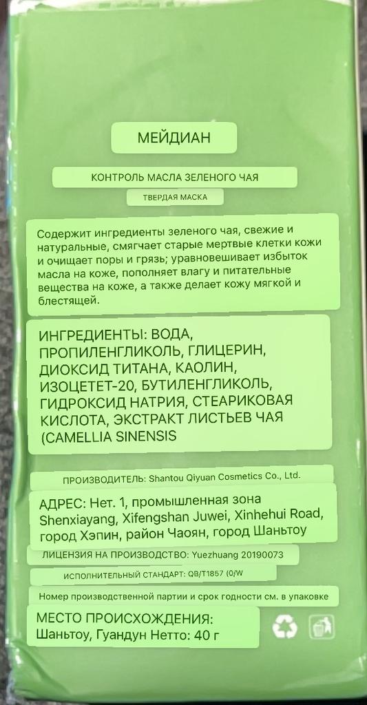Маска упакована в фирменную коробочку и запаяна плёнкой. Заказывала зелёный чай, а прислали с баклажаном. Ну такое…. Подбирала под свои потребности, но пришло не то, что надо. Обидно