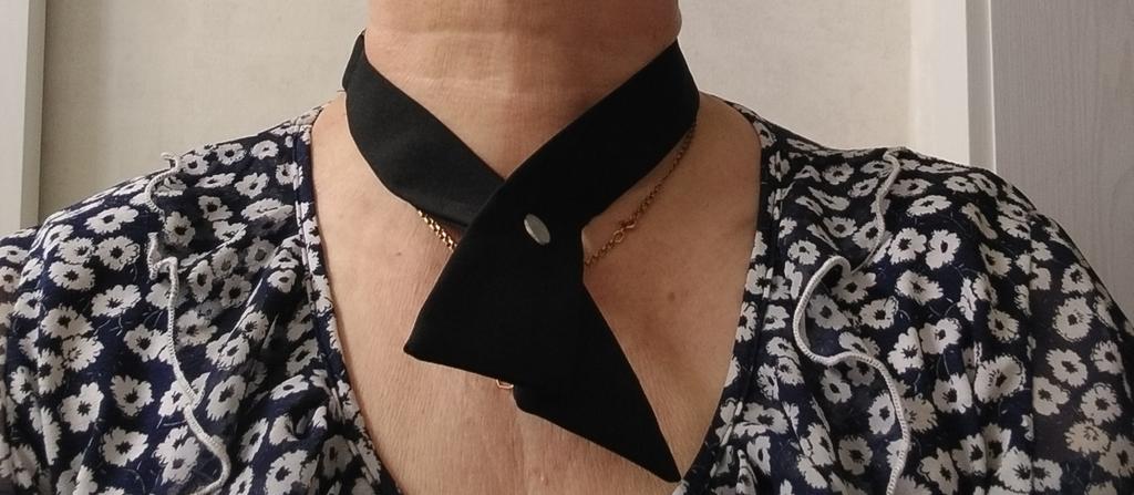 Расположен на шее не так как на картинке, видео на фото, а так всё нормально, можно регулировать длину, закрепляется впереди на кнопочку.надо, конечно примерять на рубашку, но как то так примерила.Спасибо за доставку
