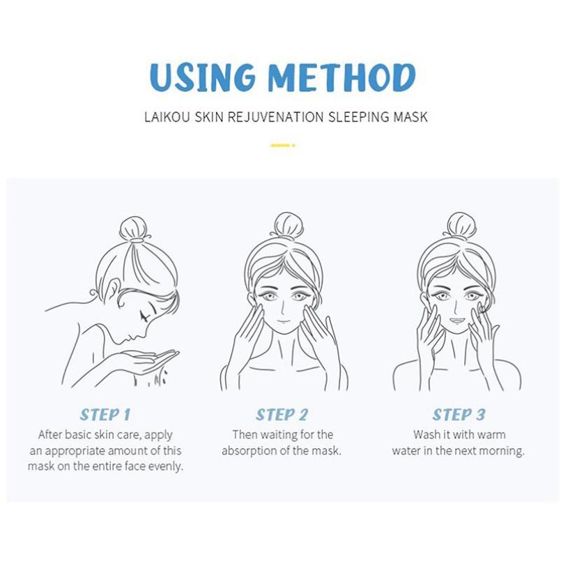Косметический эффект:Содержащая фильтрат рисового фермента и экстракт глицирхизы глабры, маска LAlKOU Skin Rejuvenation Sleeping Mask может восстановить естественный увлажняющий барьер кожи, чтобы восполнить влагу, успокоить кожу и осветлить тон кожи.