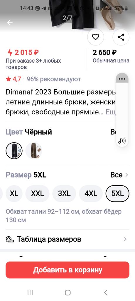 Поставила 5 звёзд, чтоб все увидели. Выписала брюки 5XL, а прислали XL, судя по замерам. Продавец , нацепил бирку непонятно какой фирмы, с маркировкой 5XL.Негодяй с большой буквы. Брала брюки за 1846р, фирмы Диманаф, даже примерить не смогла, до такой степени они мне малы. Фото прилагаю. В апреле большие размеры закончились, отсылают маломерки с маркировкой 5хл! И вконец убило сообщение: "Вы уже неделю пользуетесь товаром, дополните отзыв" Дополняю, брюки пристроить не получилось, скорее всего изрежу.