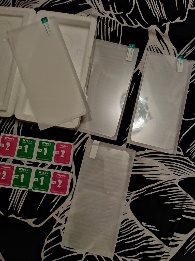 Защитные стёкла и салфетки к ним 4 шт. в индивидуальной упаковке. Всё подошло на Samsung A50, очень надёжно упакованы в пенопласт, поэтому дошли в целости и сохранности) 👍