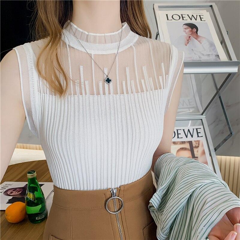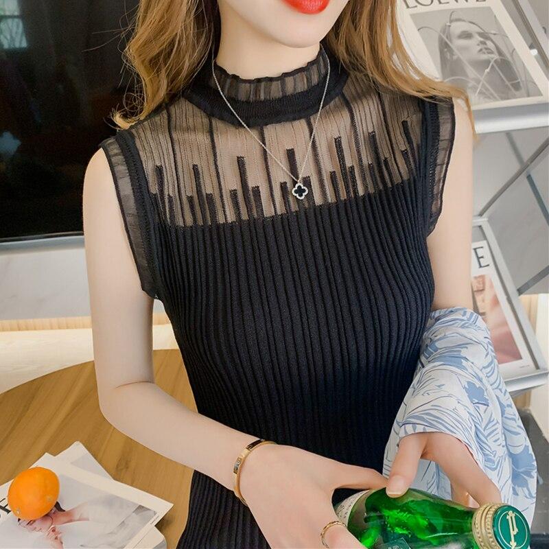 Летние вязаные блузки без рукавов, женские повседневные кружевные тонкие рубашки из ледяного шелка, женские модные однотонные женские топы, жилет 25379