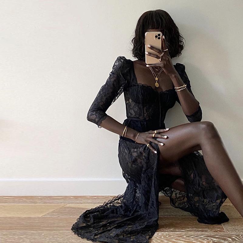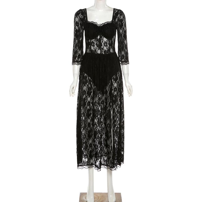 Летнее сексуальное кружевное платье с перспективой, женское однотонное платье с квадратным воротником, рукавом три четверти, открытой спиной, длинное женское платье с разрезом