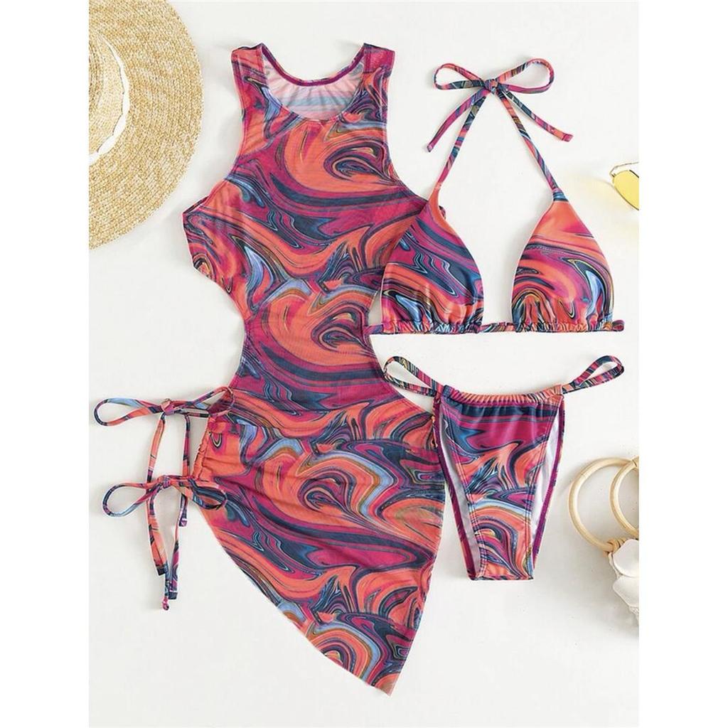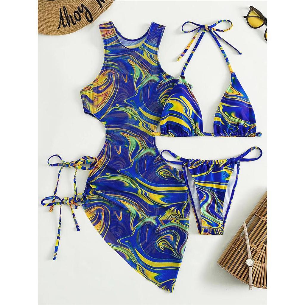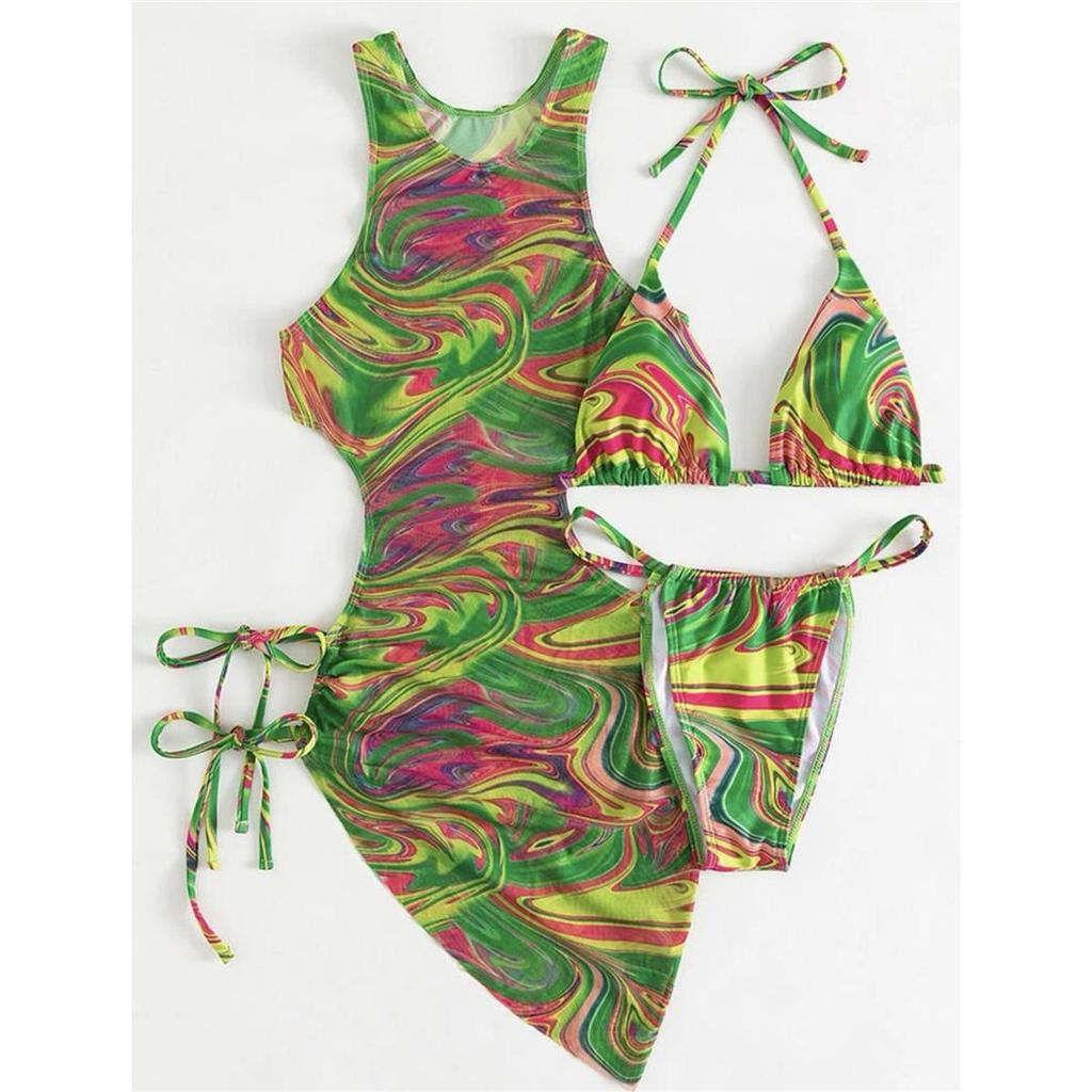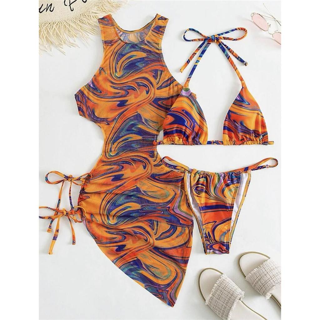 Сексуальное платье с цветным бретелем, бикини, женские купальники, женский купальник, комплект из трех частей, купальный костюм для плавания