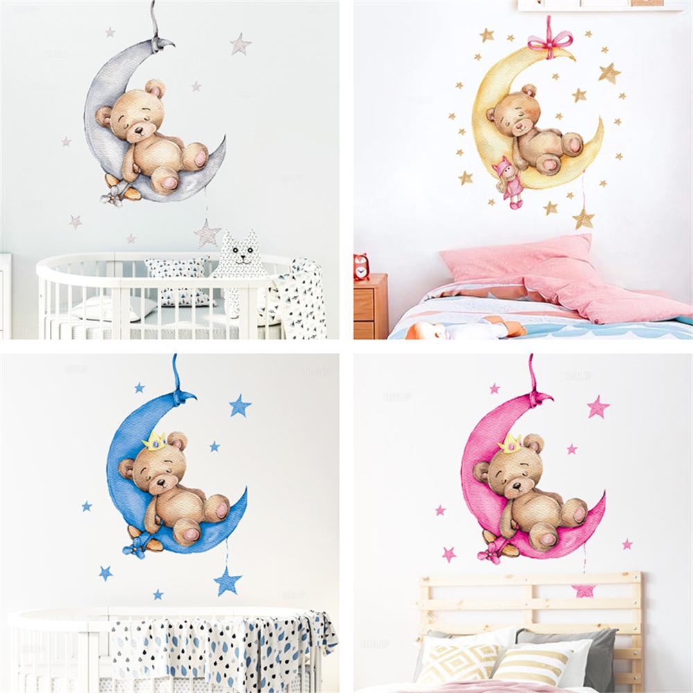 Большие наклейки на стену с лунным облаком для детской комнаты, большие наклейки со звездами и звездами для детской комнаты, украшение для спальни с медведем