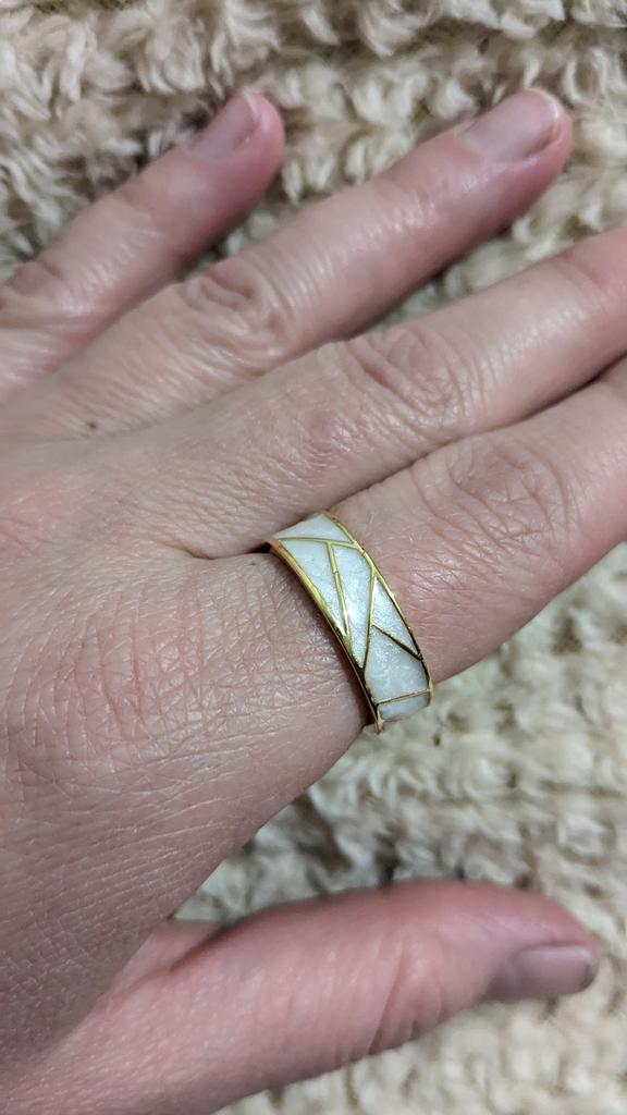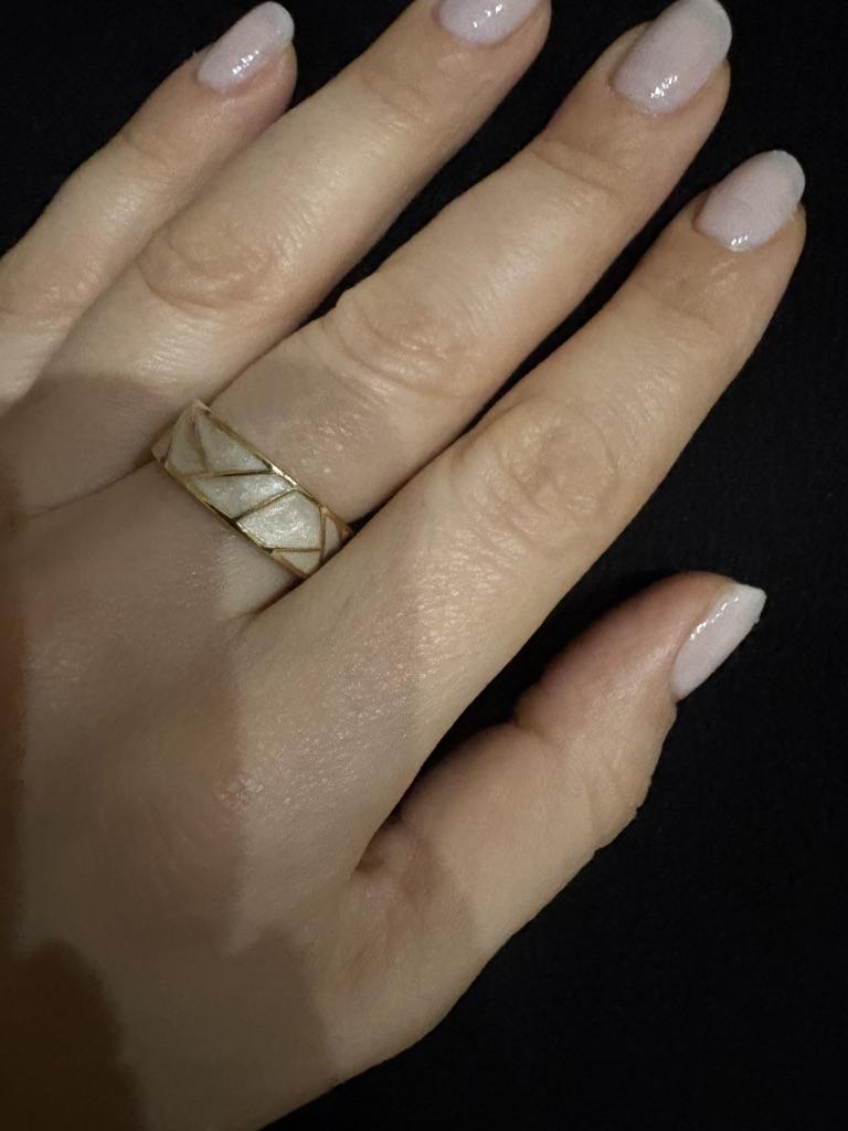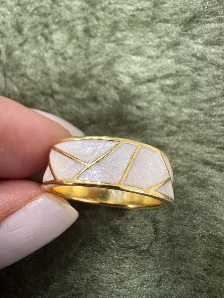 Пришло кольцо целое и окуратное. Размер соответствует. Но на фото кольцо как перламутр а в реалии заливка что то типо акрил перламутрового цвета с блеском. Типо лак для ногтей перламутровый. Расстроилась. Золотые грани очень окуратно выполнены. Быду носить и дополню по поводу как держится золото.
