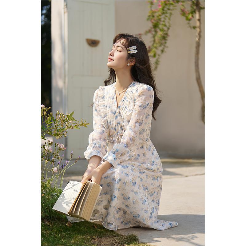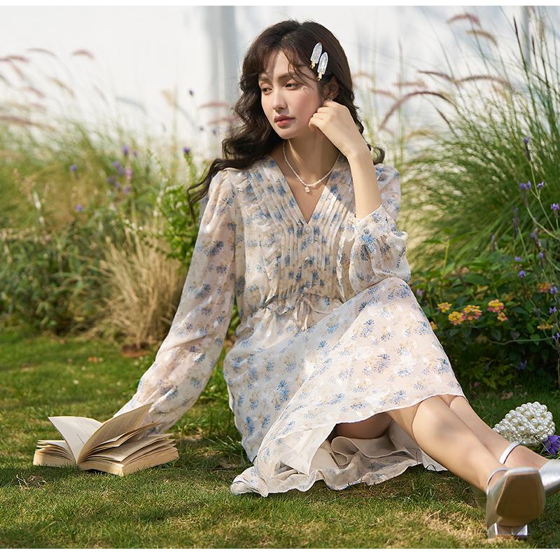 Mishow Шифоновое платье с длинными рукавами с цветочным принтом для женщин, тонкая талия, милые платья-миди трапециевидной формы с v-образным вырезом, женская одежда MXC12L1466