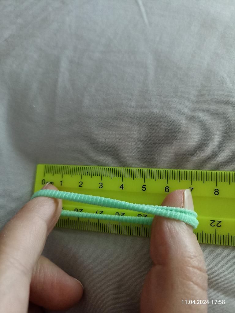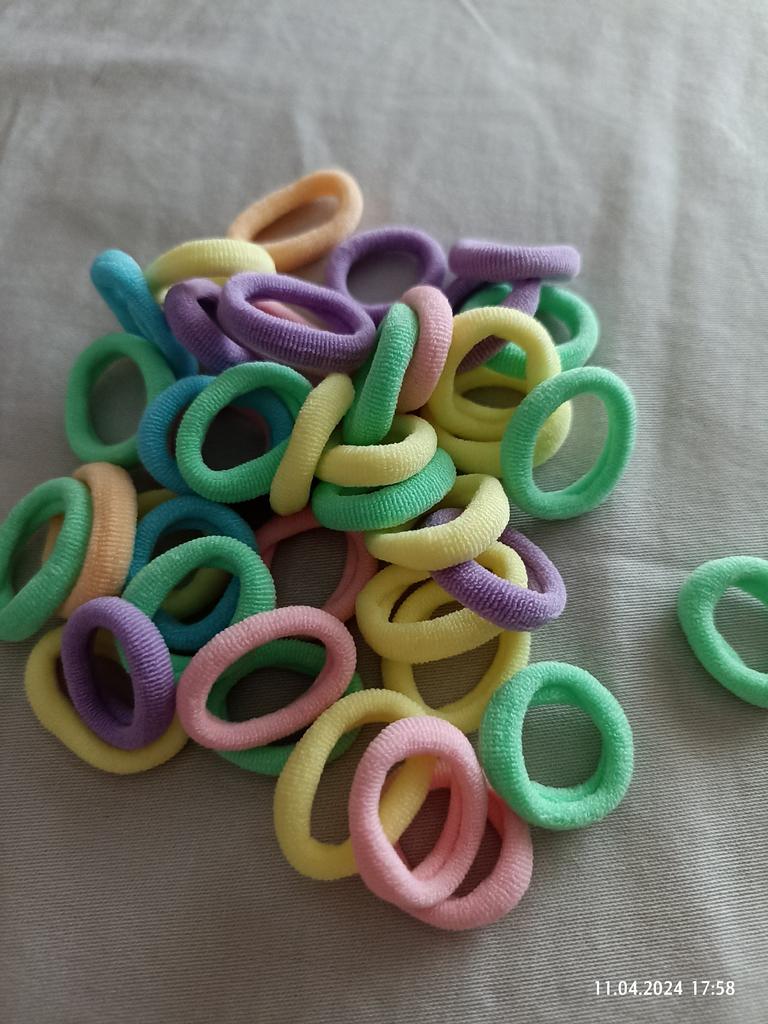 Резиночки очень маленькие! Они прекрасно подойдут для самых маленьких барышень))) или девчушкам постарше для причёсок. На тонкие волосы можно сделать три оборота, на более густые два. Одно фото для сравнения размера. Растянула почти на 7 см, но с трудом. Выбирала мягких цветов, не кислотных.