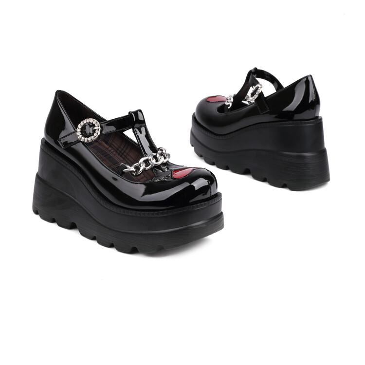 Женские туфли-лодочки из искусственной кожи, туфли на высоком каблуке на танкетке с круглым носком и Т-образной цепочкой, вечерние туфли с кристаллами в стиле панк, весенне-осенняя обувь