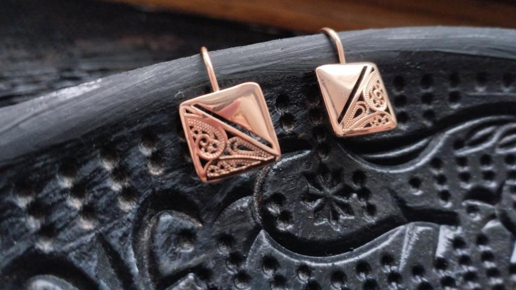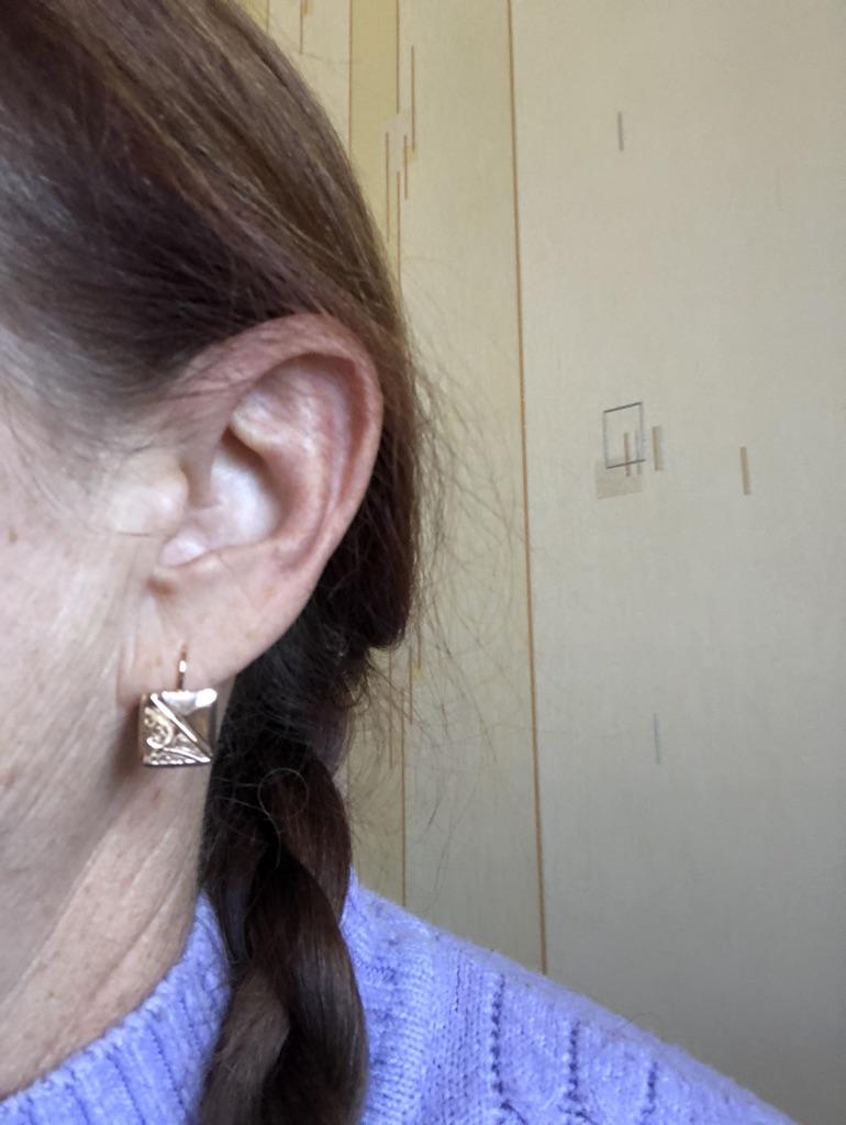 Серьги мне очень нравятся и по виду и по удобству - вообщем одни плюсы! Такие красивые, качество безупречное, знакомые делают комплементы и думают, что они золотые. Серьги сдержанные - лишь ажур и глянцевая поверхность металла. В этом их прелесть! Ещё одни есть аналогичные, тоже их люблю. Спасибо за качественное изделие и быструю доставку!