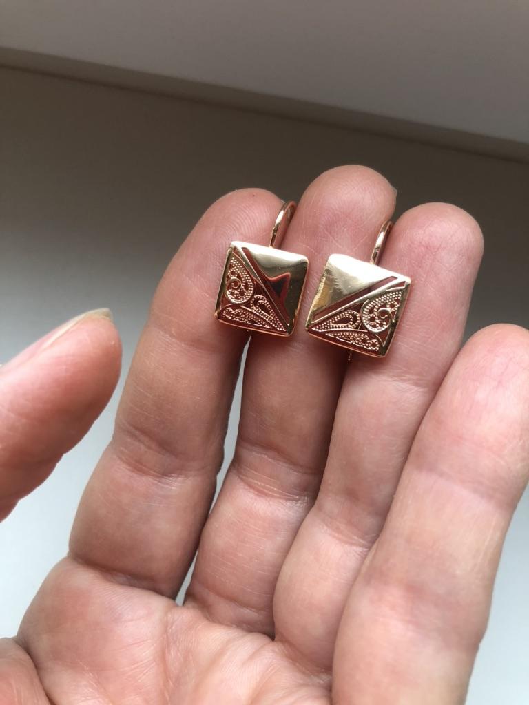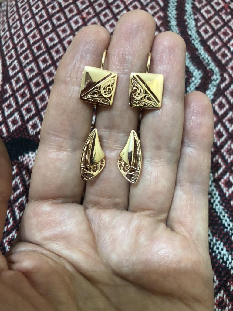 Серьги супер! Заказала для мамы, но ещё не отдала, но мне понравились очень! Не большие, хорошо выполнены, аккуратненькие, "под золото" , не отличить от золотых изделий. Интернет ужасный, хотела загрузить фото, не получается. Поверьте на слово, закажете - не пожалеете.
