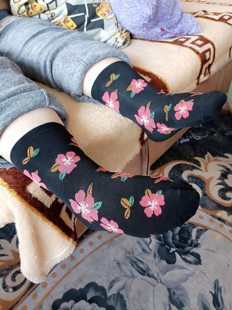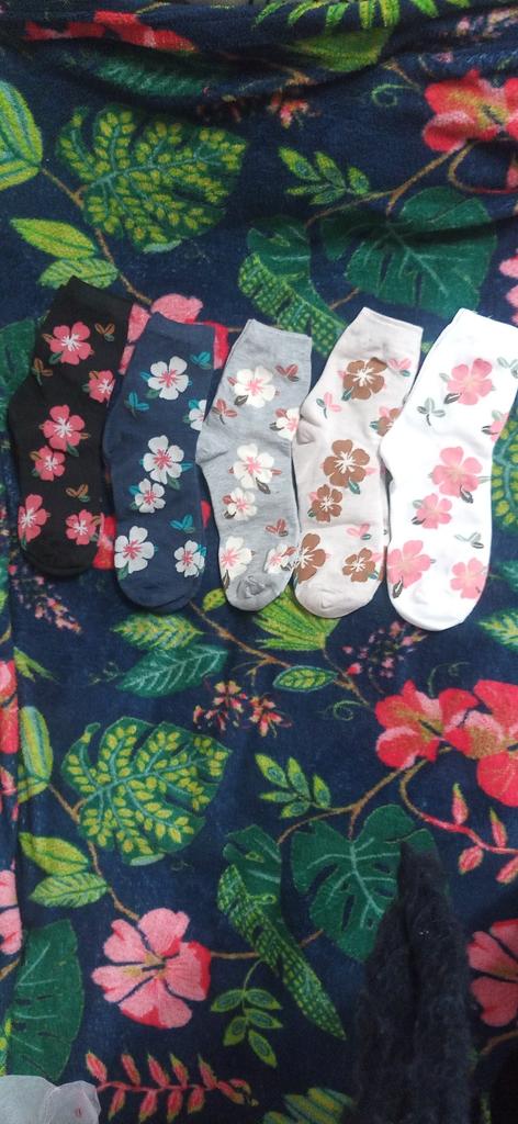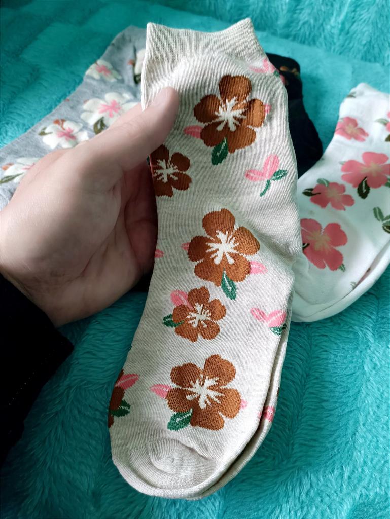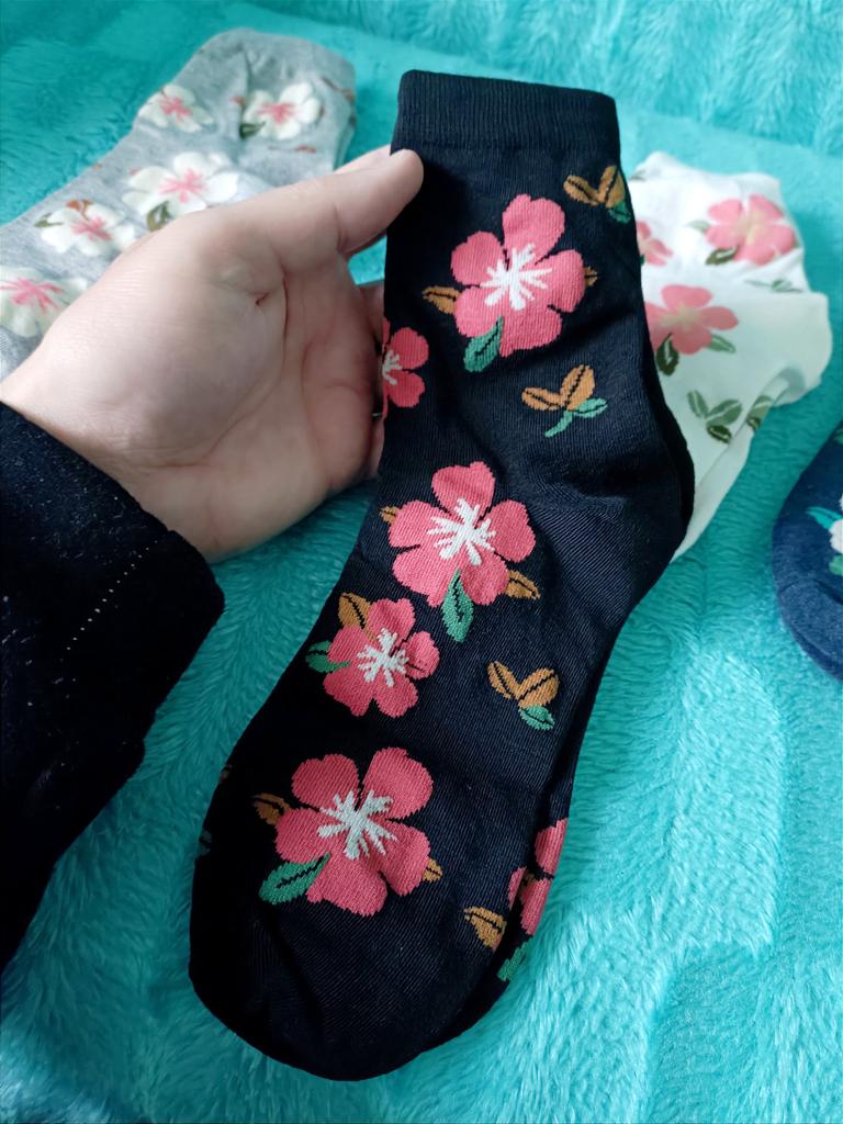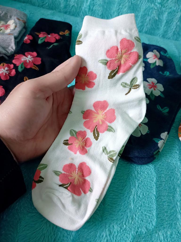 Мне с первого раза понравились эти носочки. Крупные цветы на них. Набор из пяти пар носков. Всё идеально. Спасибо продавцу. Спасибо Джум. Рекомендую.