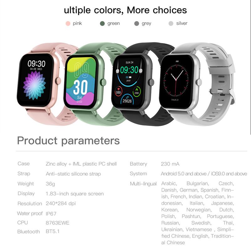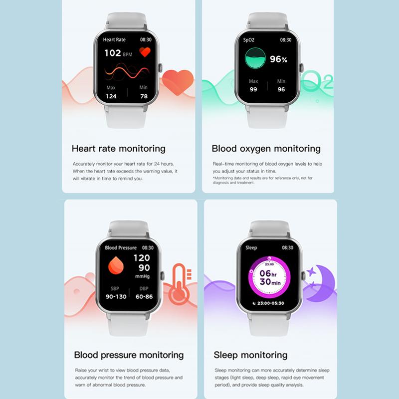 Пользовательские обои, вызов Bluetooth, управление музыкой, напоминание о социальном сообщении APP, напоминание о входящем вызове, напоминание SMS, многофункциональное упражнение, напоминание о будильнике, сидячее напоминание, поиск мобильного телефона, воспроизведение музыки, секундомер, подсчет шагов, расстояние, калории, мониторинг сна, мониторинг сердечного ритма, кровяное давление, кислород крови, поисковое оборудование, переключение языка и поднятие руки, чтобы осветить экран.
