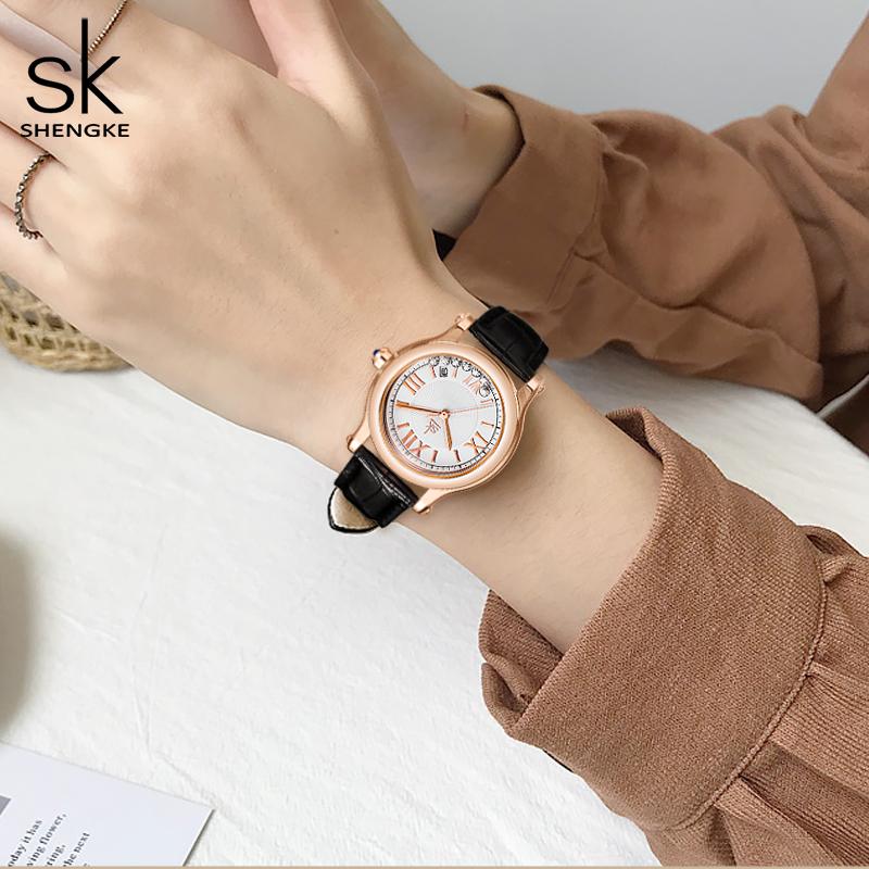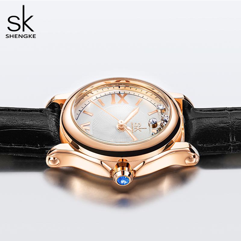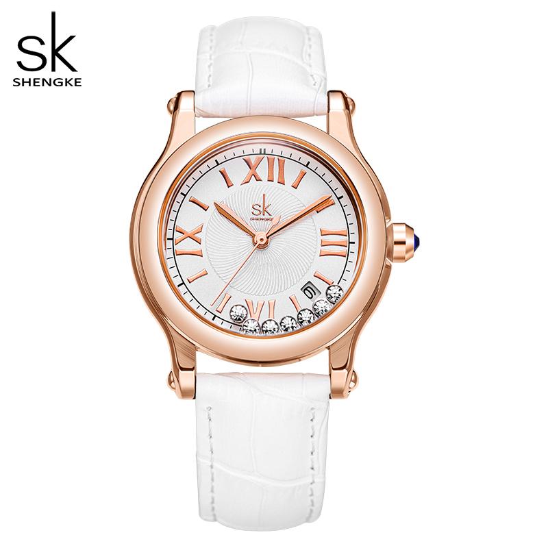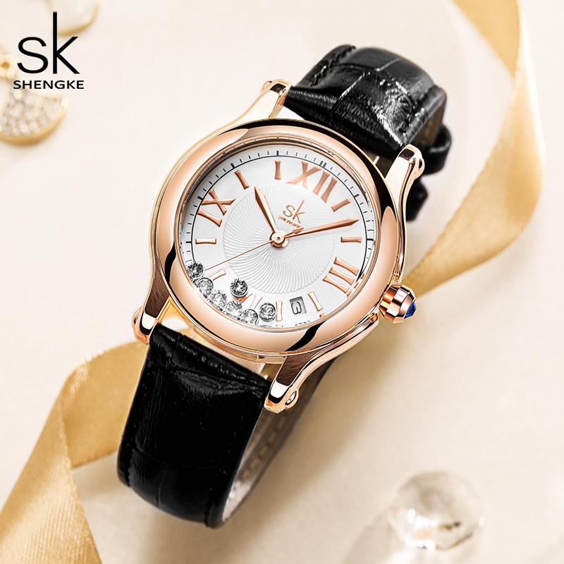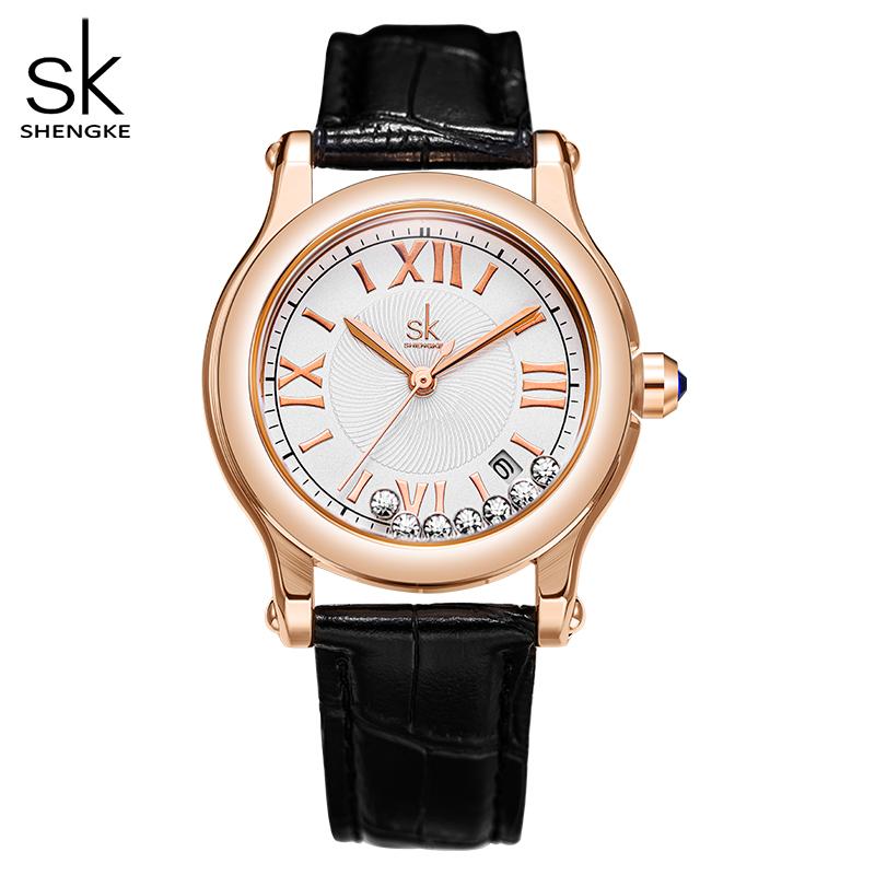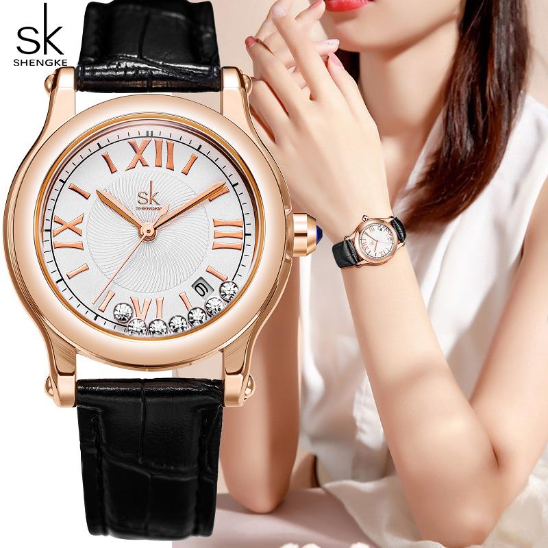 SHENGKE Новые качественные кожаные часы для женщин, японский кварцевый механизм с календарем, движущимся кристаллом на циферблате