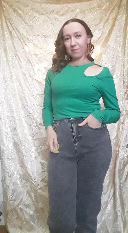 Зелёная кофточка с интересным вырезом на плече.Ткань голимая синтетика. Хлопком там даже не пахнет, как говорится в описании. Брала в двух расцветках. И оба не соответствуют размерной таблице продавца. Размер L Ог 82, по таблице 84см Рукав 63, по таблице 61см Длина 43см Материал тянется и я бы не обратила внимания на несоответствие, если бы взяла одну кофточку. А тут разница сразу ощущается. Тем более, что вторая в синем цвете аж трещит по шву когда одеваю😅. Брала и другие модели кофточек у этого продавца, но там материал получше и покрепче. Поэтому их не страшно одевать. СП решили проблемку💪👍👍👍