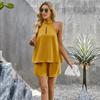 Короткие костюмы женские летние с бретелькой на шее сплошной цвет топ без рукавов шорты комплект из 2 предметов