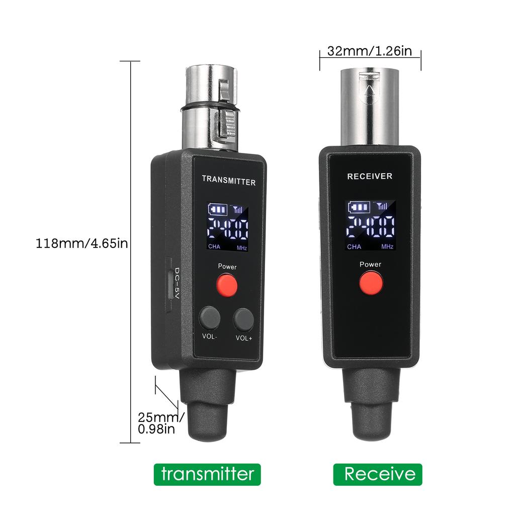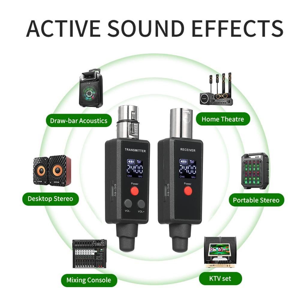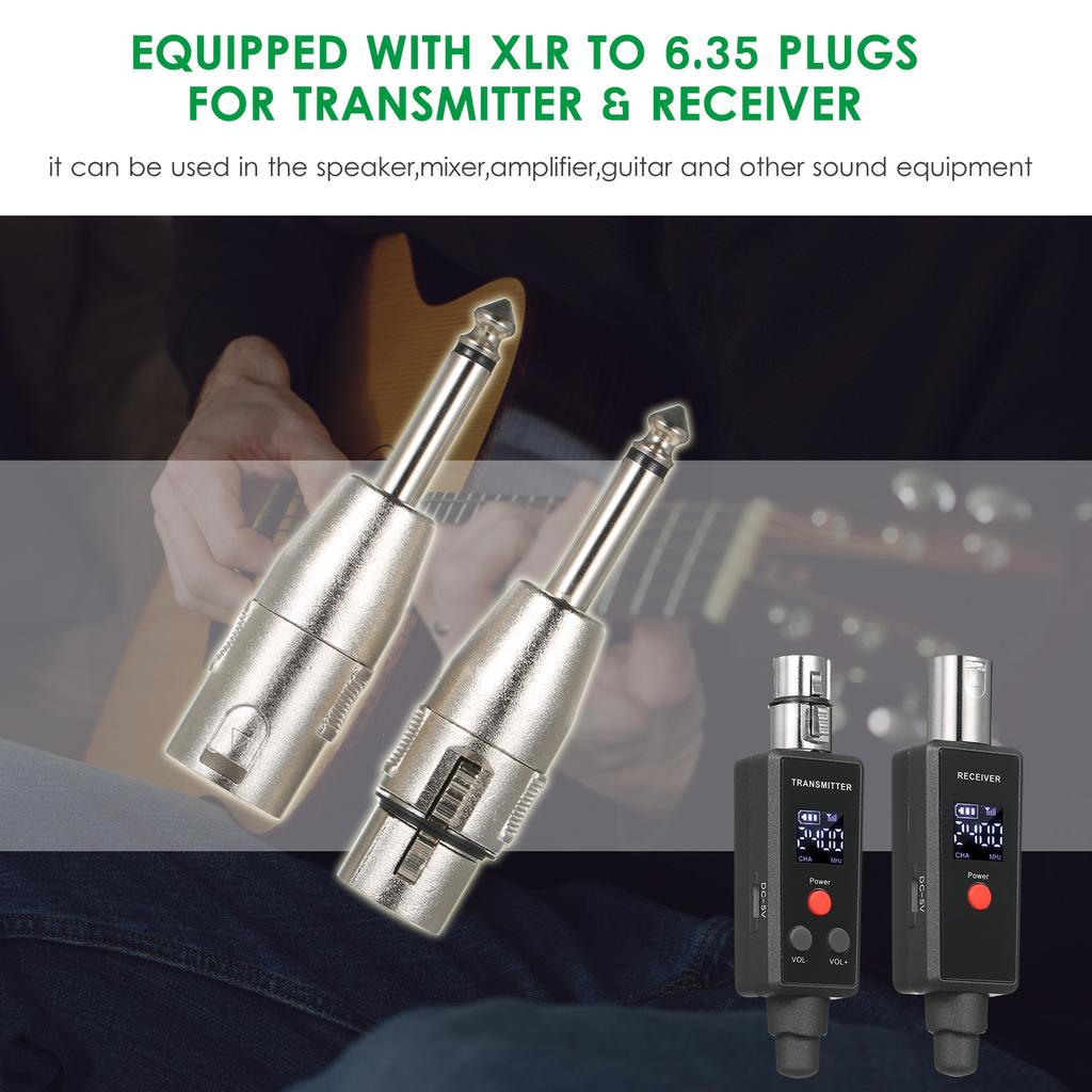 Оснащен разъемами XLR–6,35 для передатчика и приемника.: его можно использовать в динамике, микшере, усилителе, гитаре и другом звуковом оборудовании.