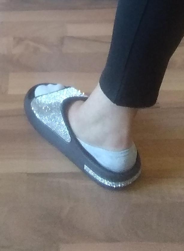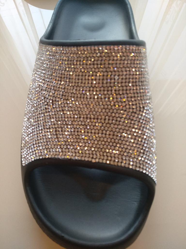 Бриллиантовые мои шлепки!!! Смотрите два видео. На стопу 24,5 см ровно заказала 39 размер по таблице продавца. Шлепки пронумерованы, стоит на подошве 39. Они мне свободны. Шлепки имеют бортики и если придвинуть пальцы кпереди, то возле пятки есть запас 1,0 см. Так что брать надо по таблице, малы точно не будут. Ещё хочу отметить, что они на широкую ногу и на высокий подъем. У меня нога с огромными косточками, ширина через косточку 25,5 см. Эти шлепки мне хороши, нигде не давят, легко входит стопа и легко стряхивается с ноги. Чего в других шлепках никогда не бывает. Материал ЭВА. Монолитная штамповка !!! с наклеенными стразами. Они сидят прочно, при транспортировке не отлетели и вряд ли отлетят(мне кажется , что клеевая основа прочная) Подошва под стопой чуть больше сантиметра, с бортиками 2 см. Длина внутреннего углубления 26 см Переливаются феерично и на солнце и при домашнем освещении. Советую модницам с высоким подъемом стопы и дамам с широкой стопой.